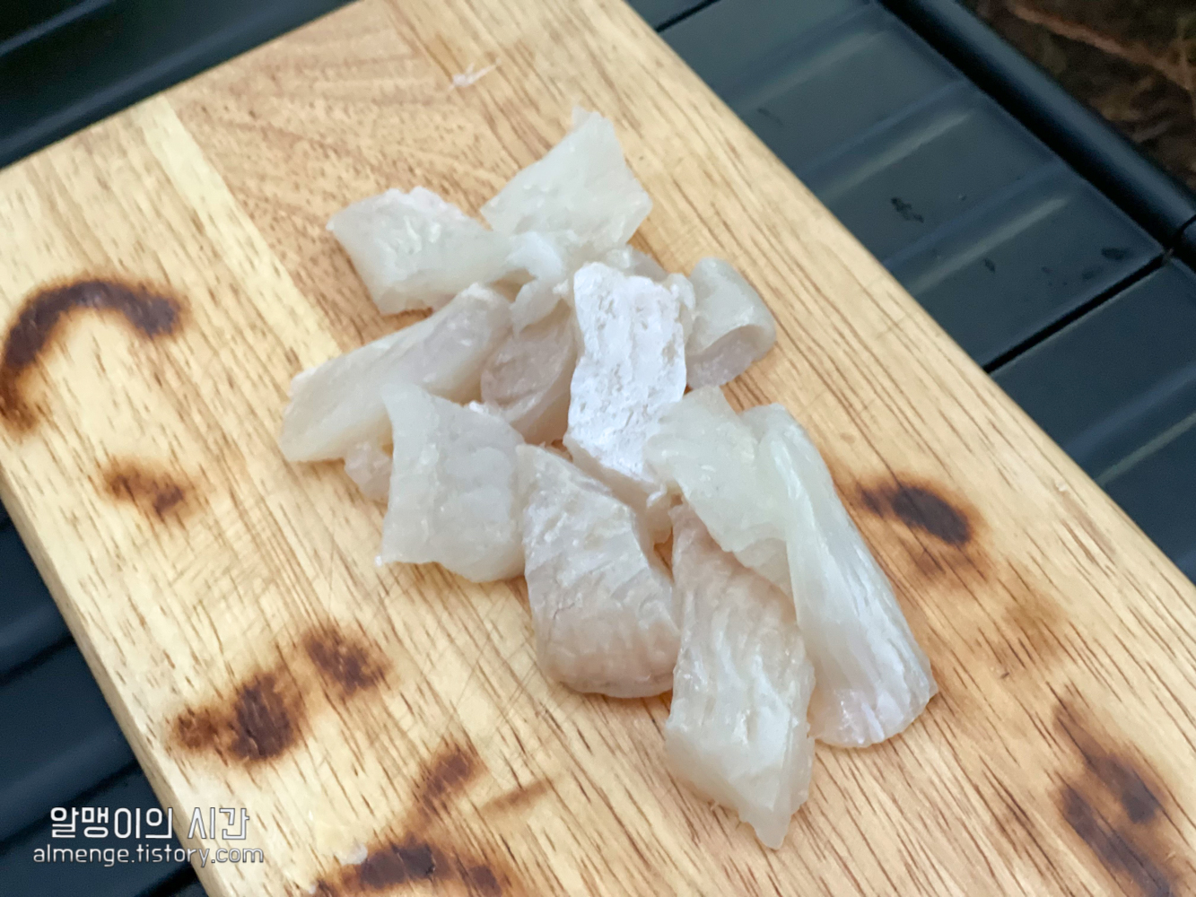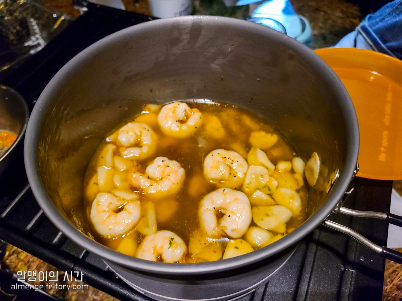 원없이 산책을 마치고 3차전을 벌이는데, 양은 주전자 오뎅, 회, 항정살은 저리 가라 정도의 메뉴들이 계속 튀어나옴. 아 이 사람들 정말 캠핑 음식에 진심이다.