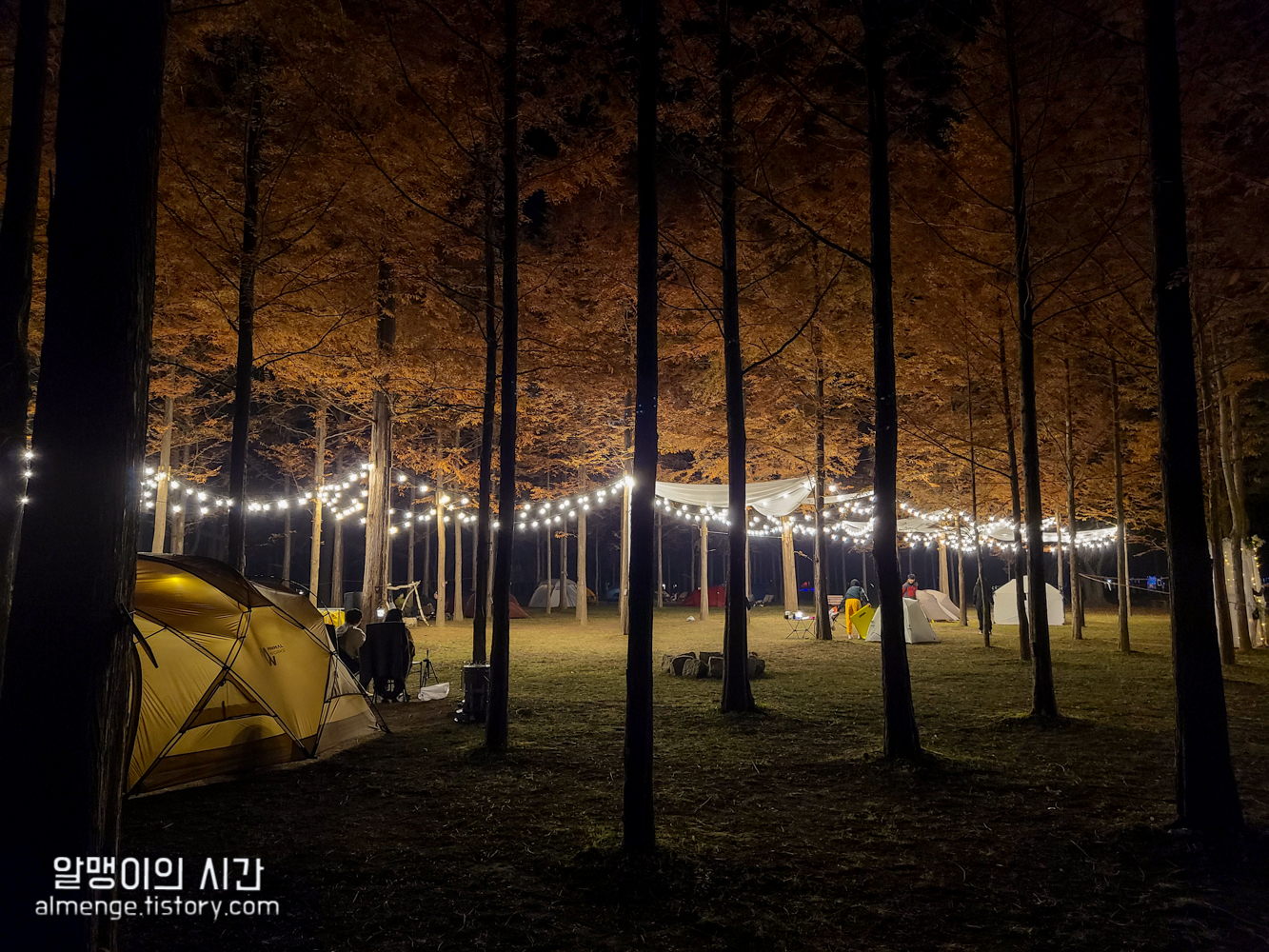 부른 배 두들기며 섬이나 한 바퀴 둘러보기로 하는데 어느덧 옆 캠핑존2에 켜진 조명이 예쁘게 빛나고 있다. 실제로 보면 훨씬 밝아서 저 아래 텐트를 친다면 눈뽕 장난 아닐듯. 그래도 보기엔 예쁨.