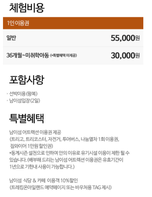 물론 55000원 안에는 남이섬 입장료&선박 이용료(정가 13000원), 남이섬 어트랙션 이용권(1가지 선택. 종류마다 다른데 대략 10000~15000원 상당)가 포함되어 있다. 그래도 비싸다는 생각을 지울 수가 없는데... 막상 다녀와보니 좋긴 하더라 ㅎㅎ 그럼 본격적인 후기 시작합니데잉
