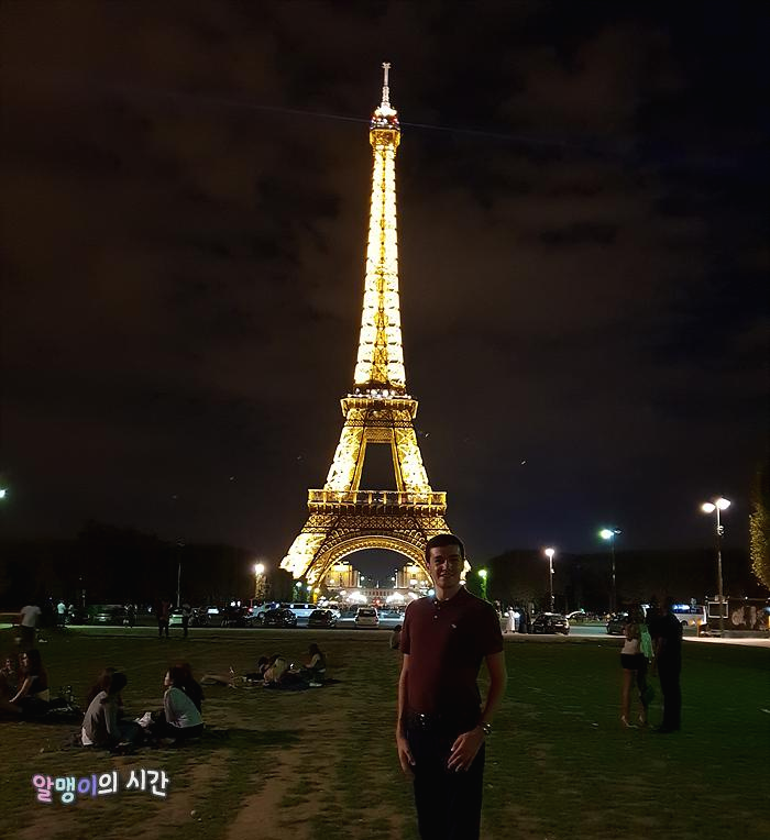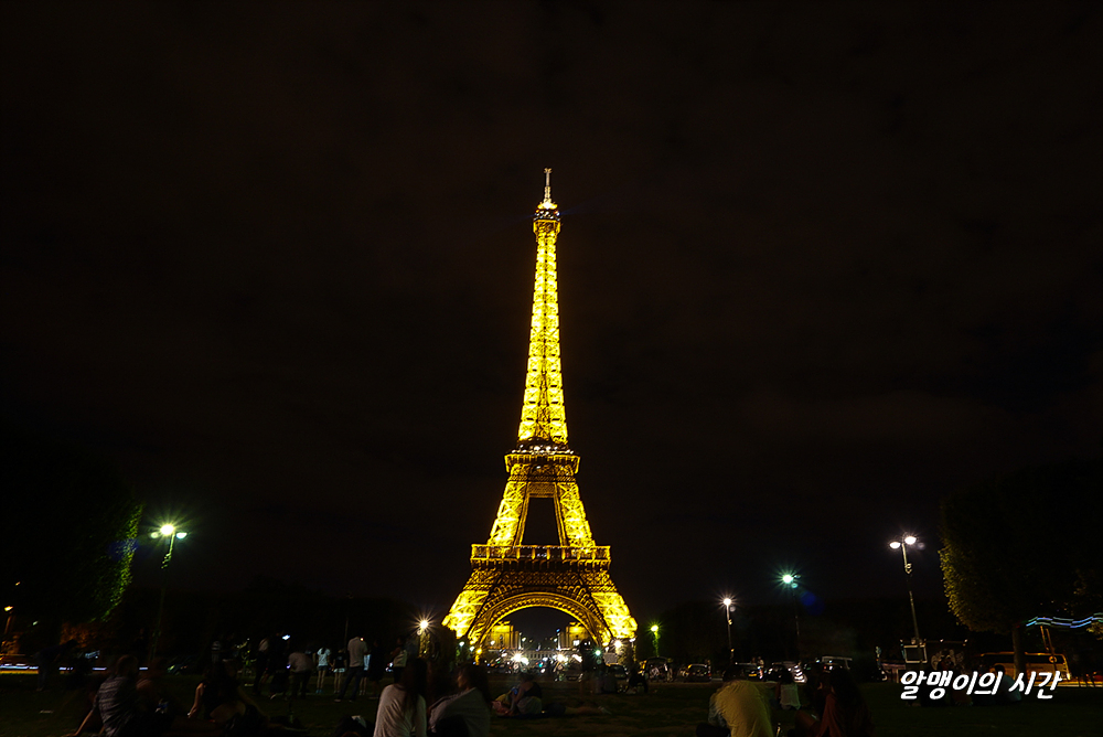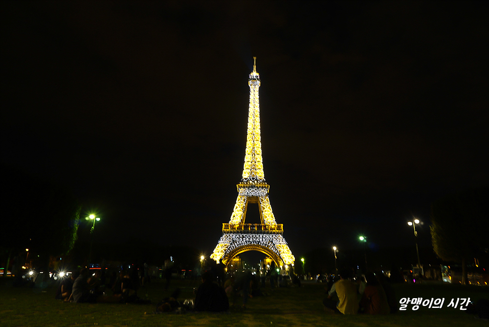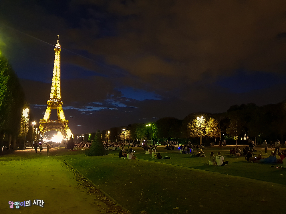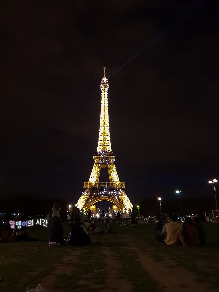 돗자리도 안가져와서 A4용지 깔고 잔디밭에 앉음. 내가 적당한 곳에 자리잡고 앉자마자 타이밍 맞춘 듯 바로 시작되는 점등식. 매시 정각 반짝인다. 언제 봐도 황홀한 점등식 모습. 뭐에 홀린듯 보게 된다. 작년엔 에펠탑 보이는 숙소를 잡아 여행했어서 숙소 창가에 앉아 꼬박꼬박 봤던 점등식을 코 앞에서 보니 느낌이 또 다르다.