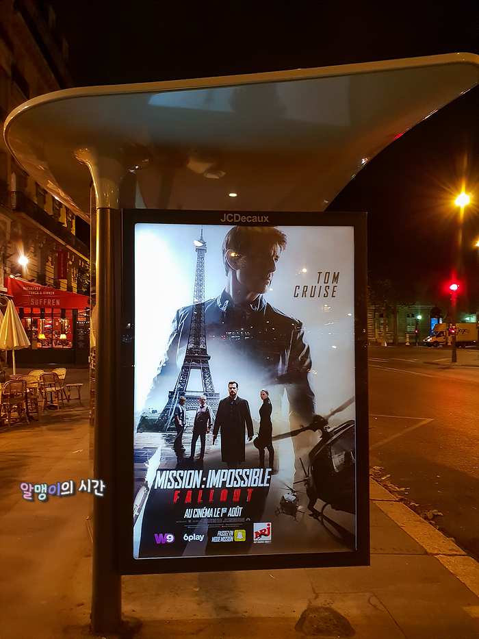 12분 정도를 달려 La Motte-Picquet – Grenelle 역에서 내림. 여기서 10분 정도만 걸으면 내 눈앞에 나타날 예정인 에펠탑. 때마침 개봉중이었던 미션임파서블 폴아웃. 난 이미 한국에서 보고 왔는데, 마침 이 시리즈엔 파리가 주요 배경으로 나온다. 파리에서 찍은 영화 포스터를 파리에서 보니 반가워서 한 컷!