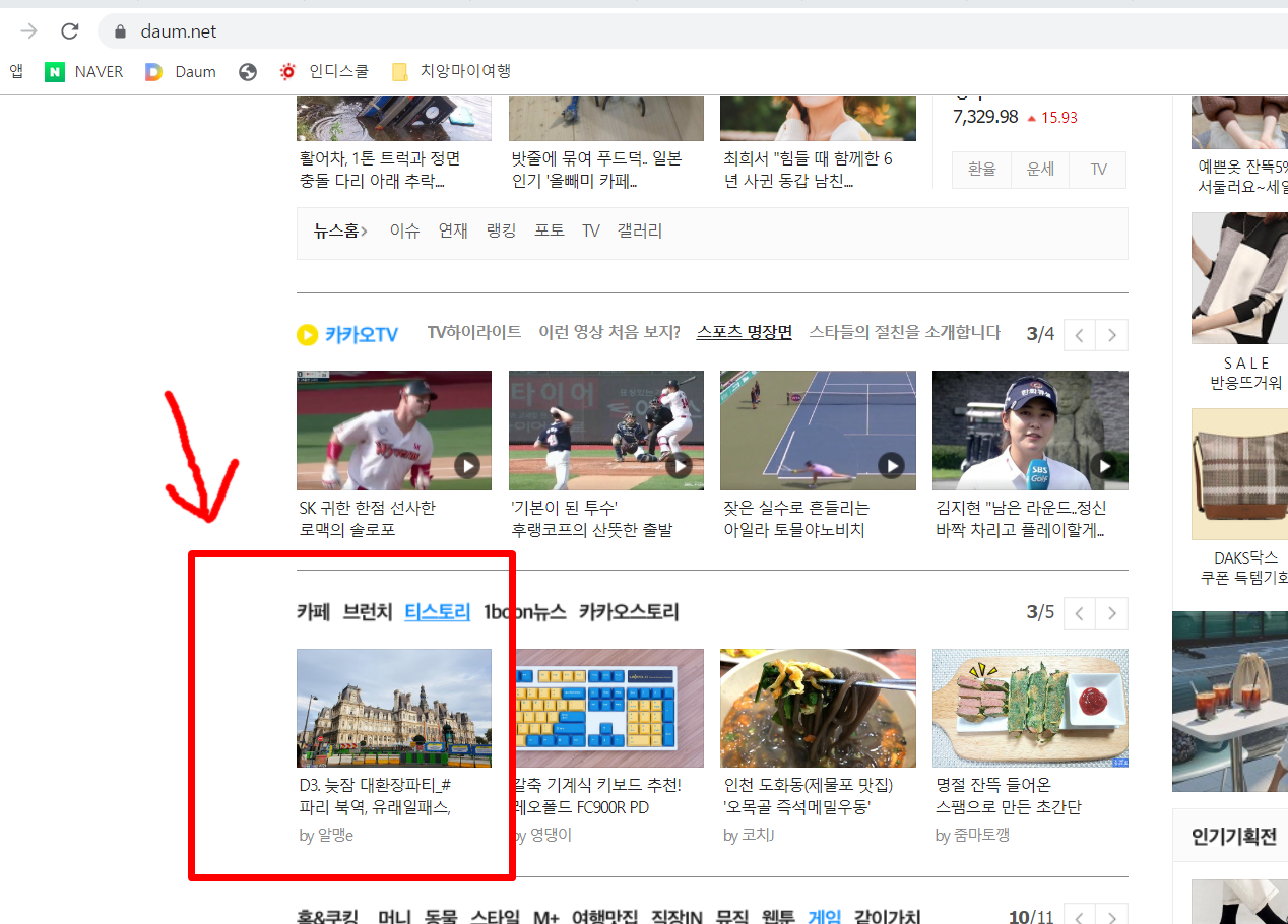 그랬더니 모바일은 아니고, PC버전 다음 홈페이지 티스토리 탭에 떡하니 이 포스팅이 걸려있는게 아니겠어요?