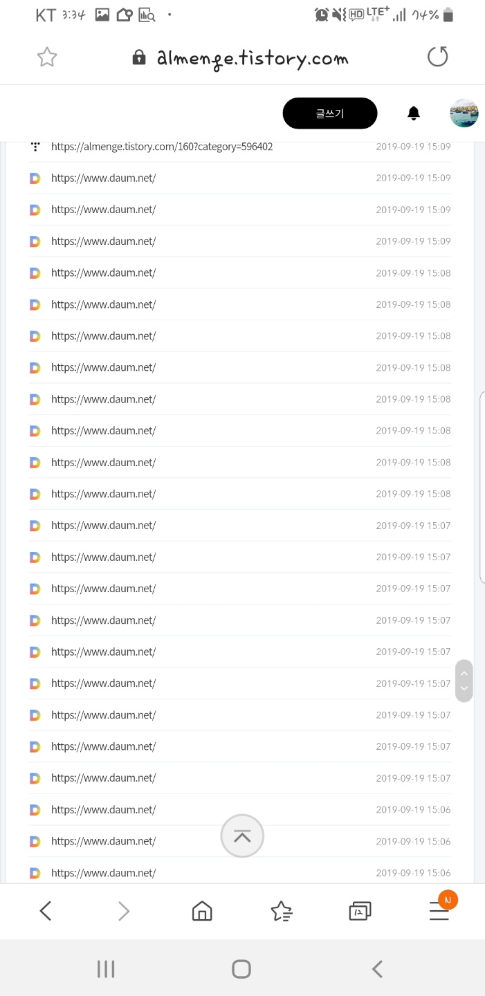 그러다 올해 1년만에 컴백하고 첫 글을 쓰고 이틀이 지난 날. 잠깐 쉬면서 무심코 블로그에 들어갔는데 이상하게 평소보다 방문자가 많은거예요~ 관리자 페이지에 들어갔더니 모든 유입이 저렇게 다음에서....