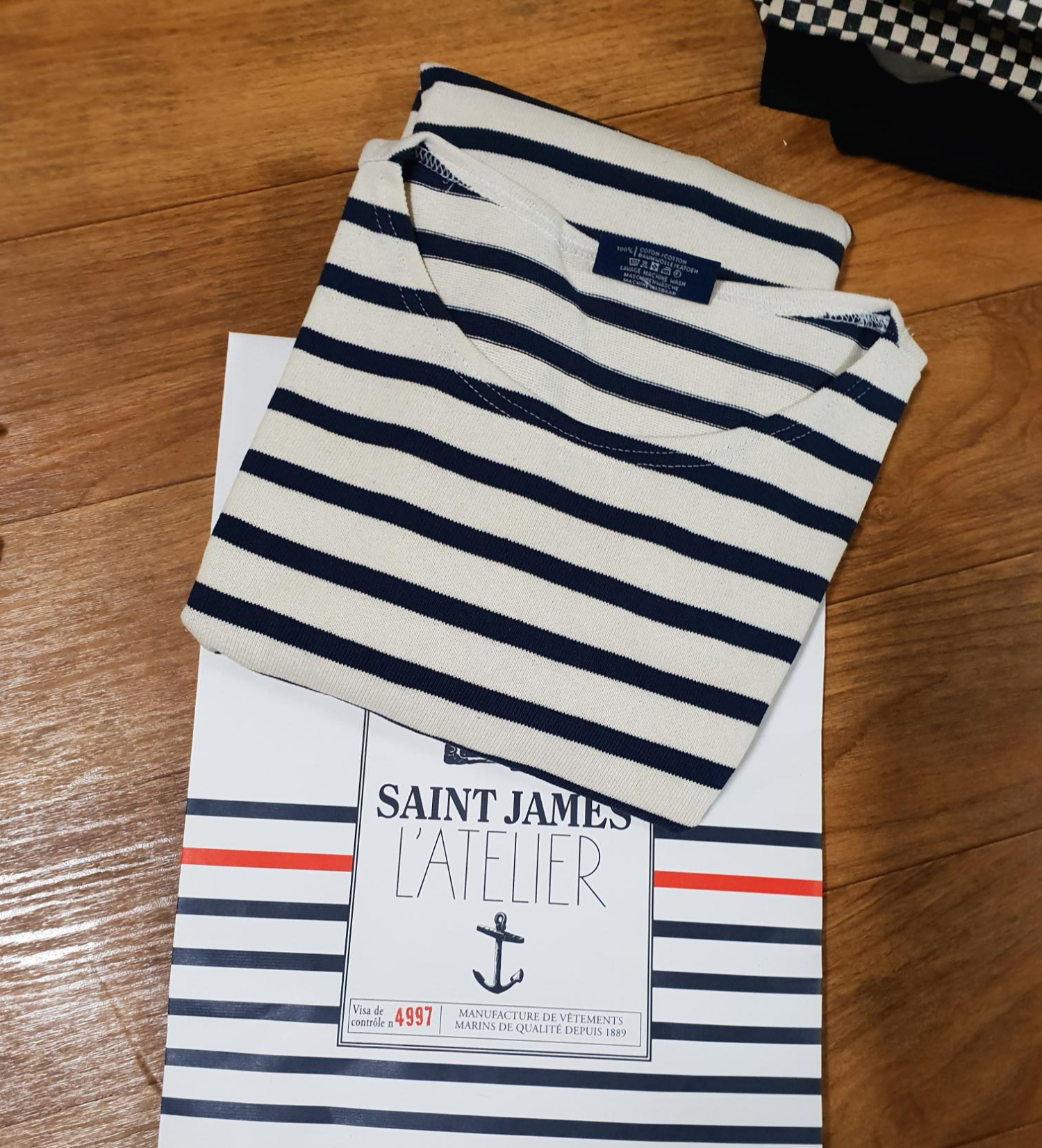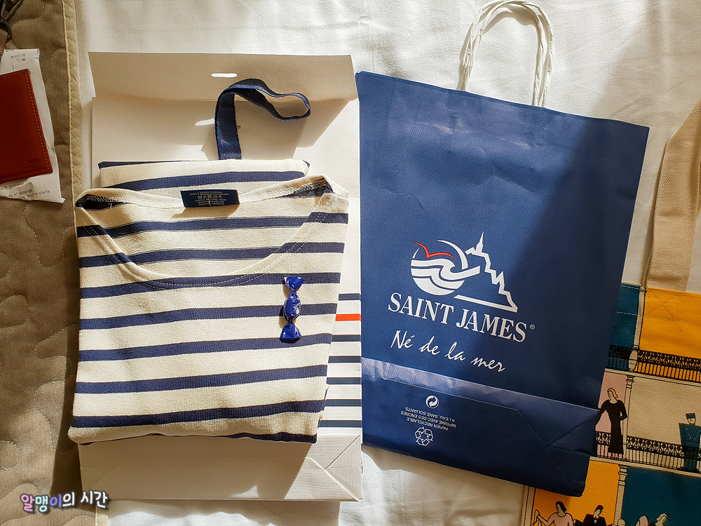 아빠 선물로 산 세인트제임스(생제임스) 니트티. 아빠가 평소 영(young)한 스타일을 추구하셔서 청바지를 즐겨입으시는데 거기에 어울릴만한 걸로 단가라티가 생각났어요. 생제임스는 한국에서 사는 것보다 파리가 더 싸다길래 봉마르셰 백화점 근처 지점 가서 구입하게 되었습니다. 밍콰이어 라인같은 얇은 티셔츠가 아니라 가을~초겨울용 니트에요. 57유로(약 72000원)에 구입했습니다.