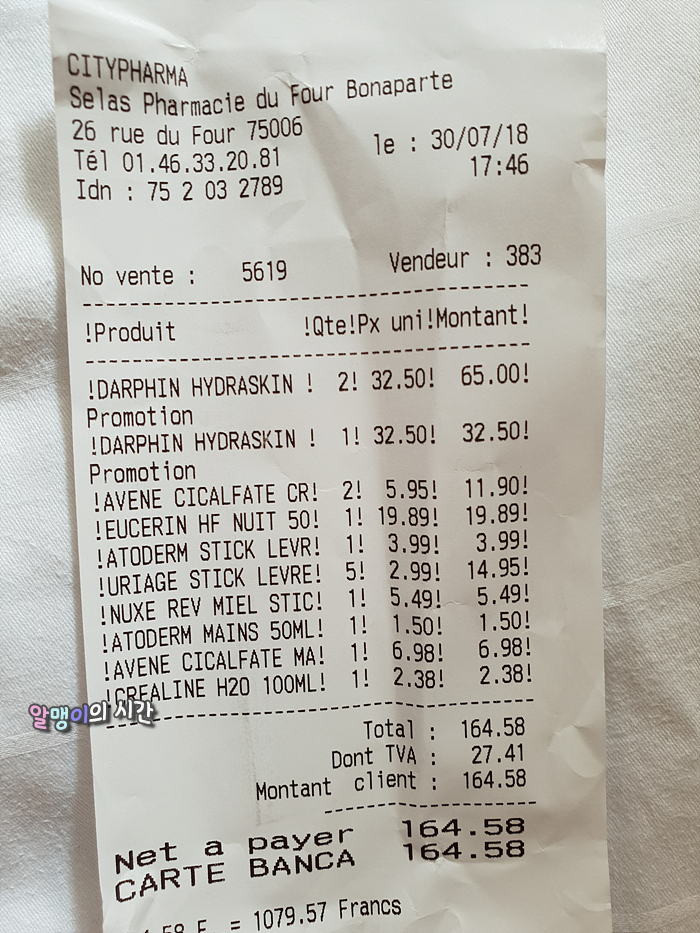 이건 시티파르마에서 산 약국 화장품 쇼핑샷. 요즘은 한국에서도 살 수 있는게 많고, 인터넷 면세에서 사는게 현지에서 사는 것보다 더 싼 제품도 많으니 많이 사진 않았어요. 딱 쓸 것, 필요한 것만 사서 이 정도 샀어요. 모두다 164유로에 구입.