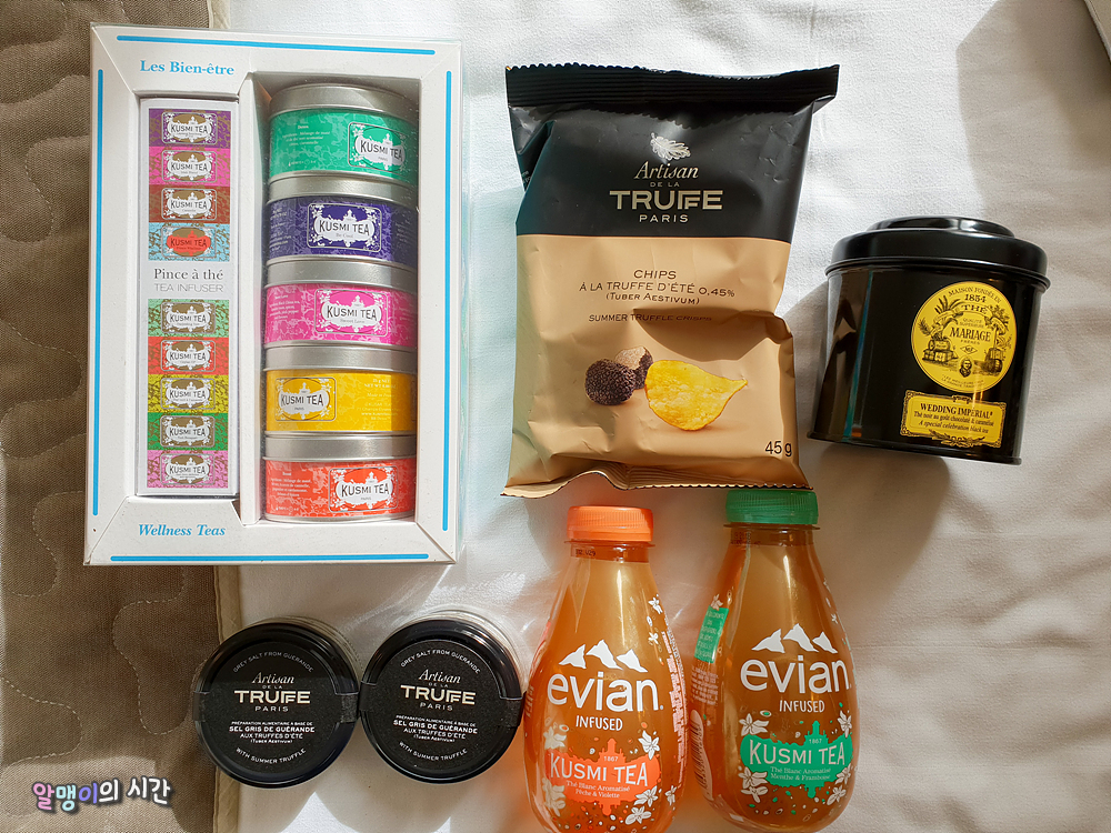 트러플 감자칩, 쿠스미&에비앙 티음료는 괜찮긴 한데 한국까지 운반하긴 좀 힘드니 사서 현지에서 드셔보는거 추천. 쿠스미는 원래부터 잘 마시던 티에요~