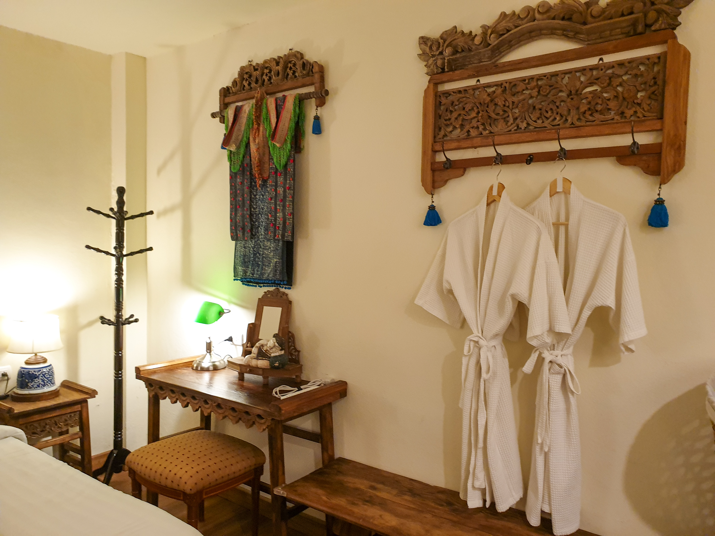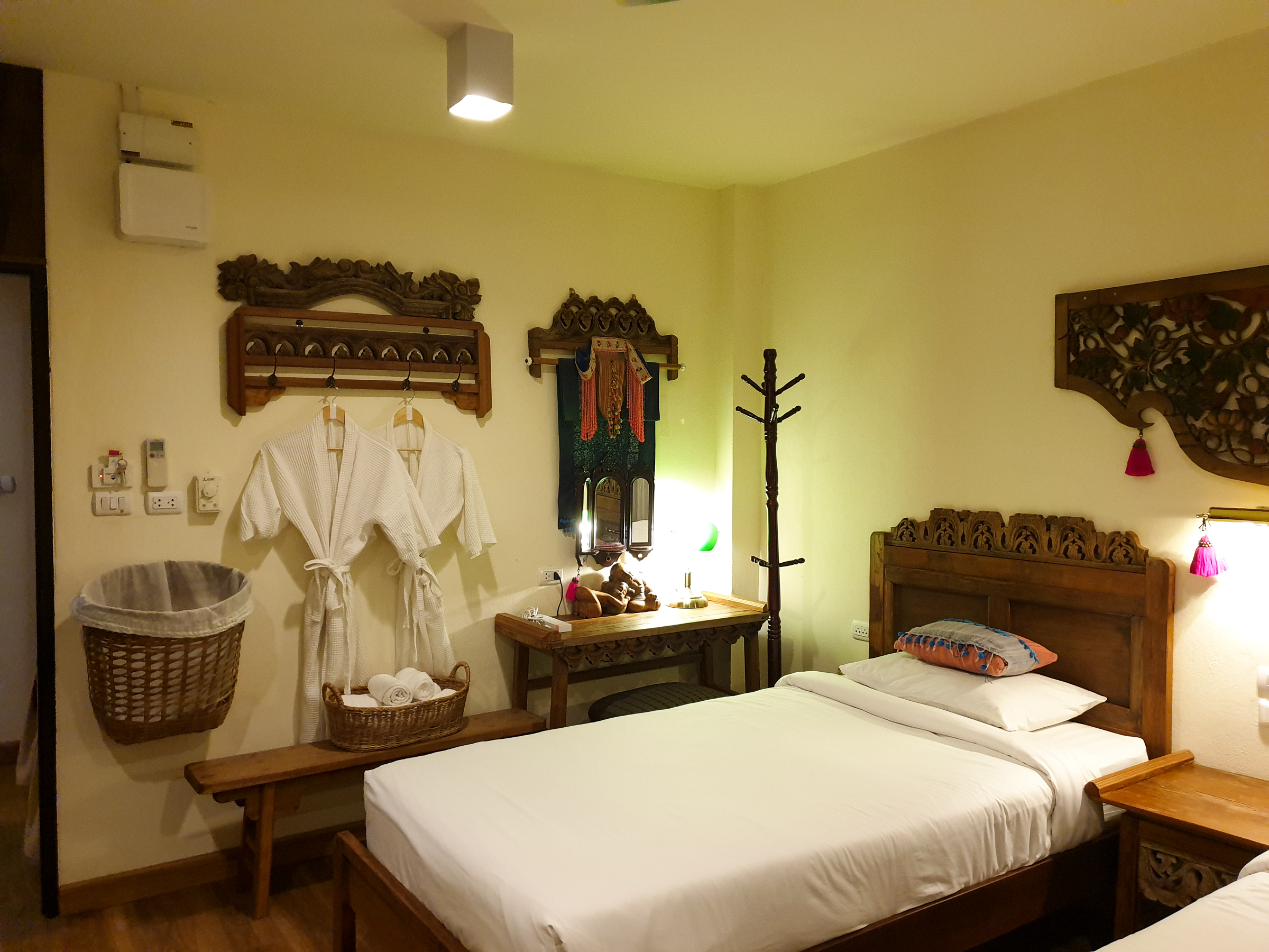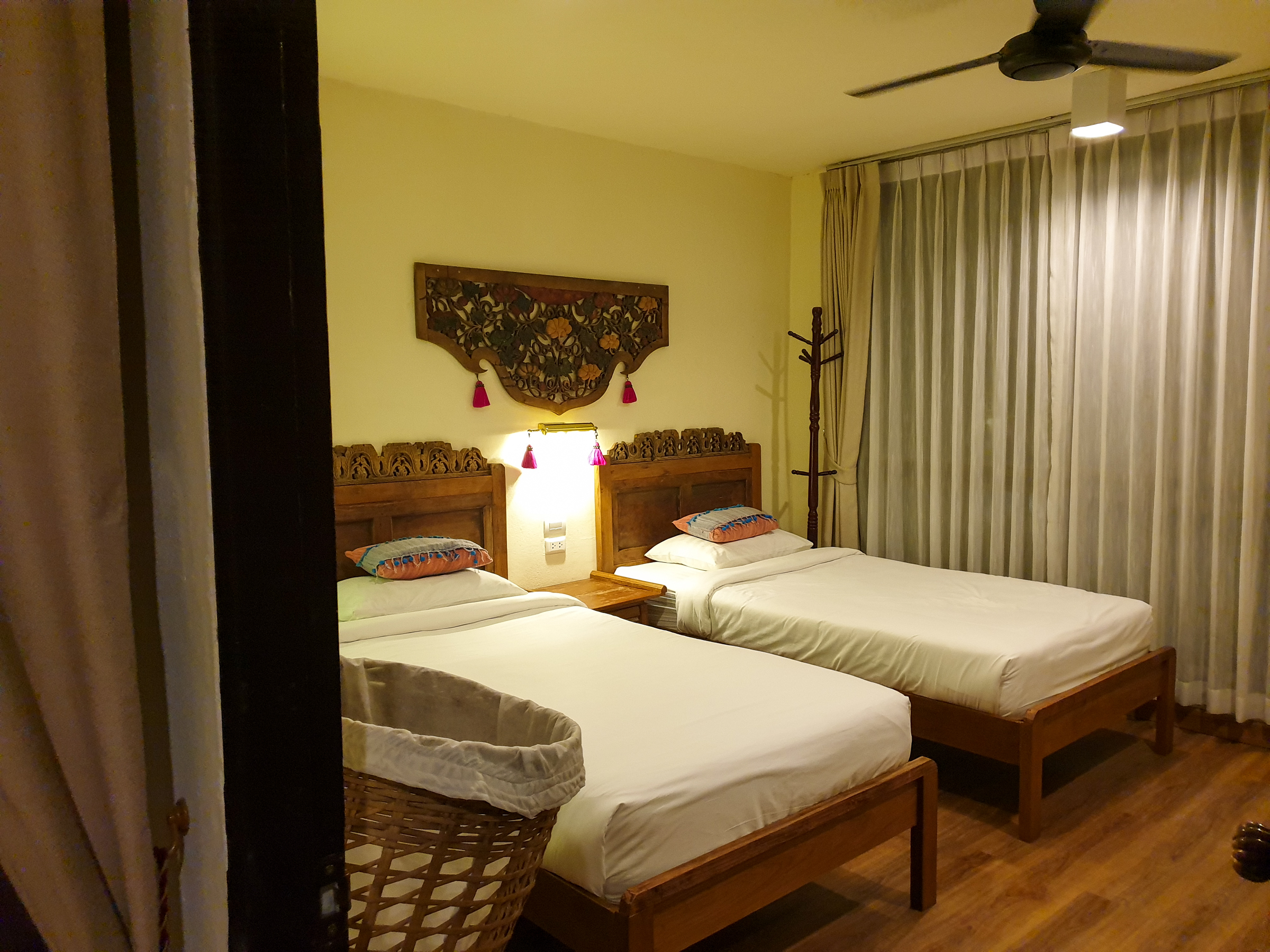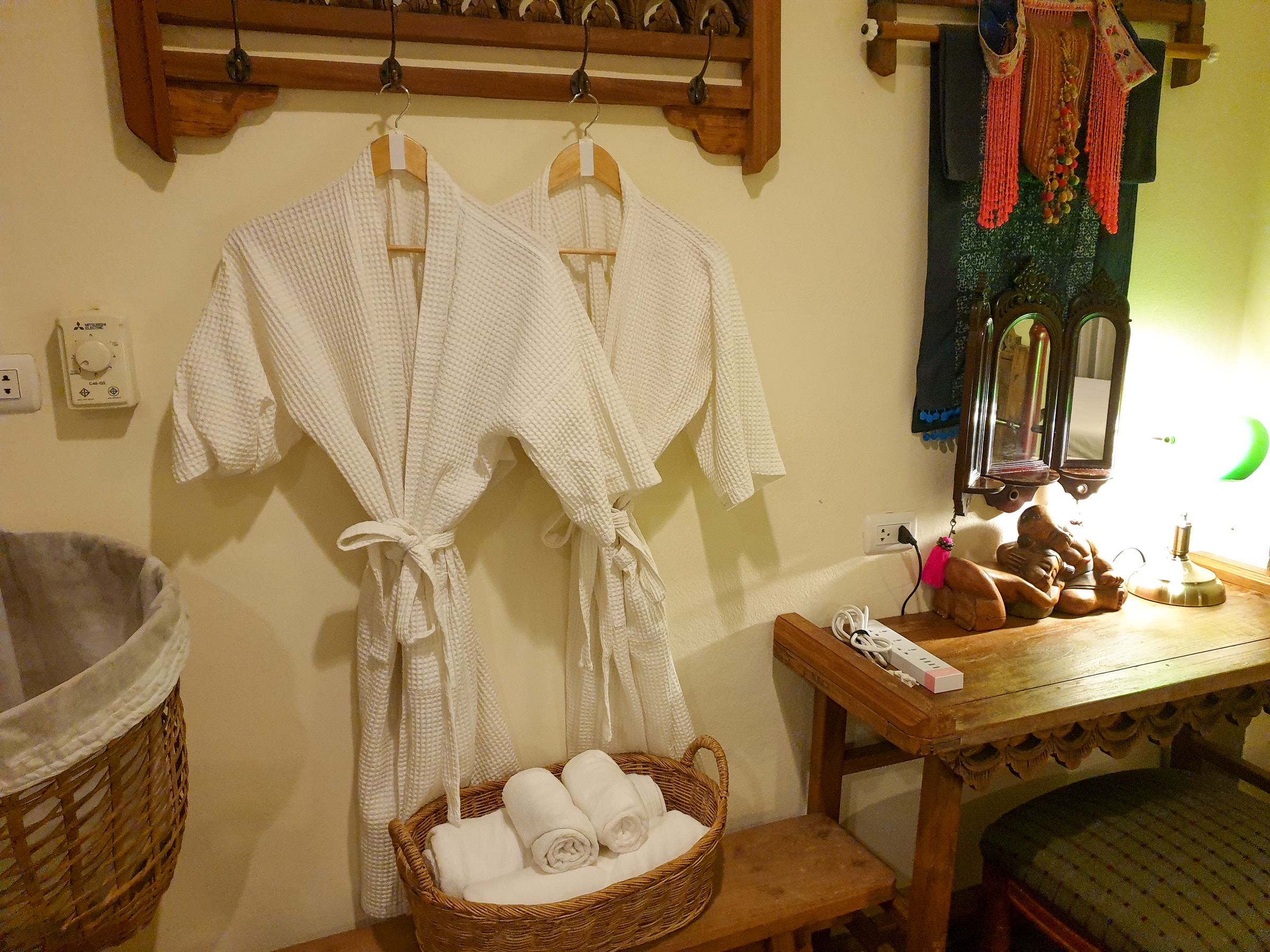 숙소 소개 사진과 거의 일치하던 방의 모습. 3일 동안 넉넉히 쓰고도 남았던 수건들. 그리고 목욕 가운, 멀티탭도 방마다 다 있었어요. 다 쓴 수건을 왼편의 바구니로 슝. 태국의 가옥 천장에 흔히 설치되어 있는 저 돌아가는 환풍기?선풍기 같은 것도 방마다 있었어요.