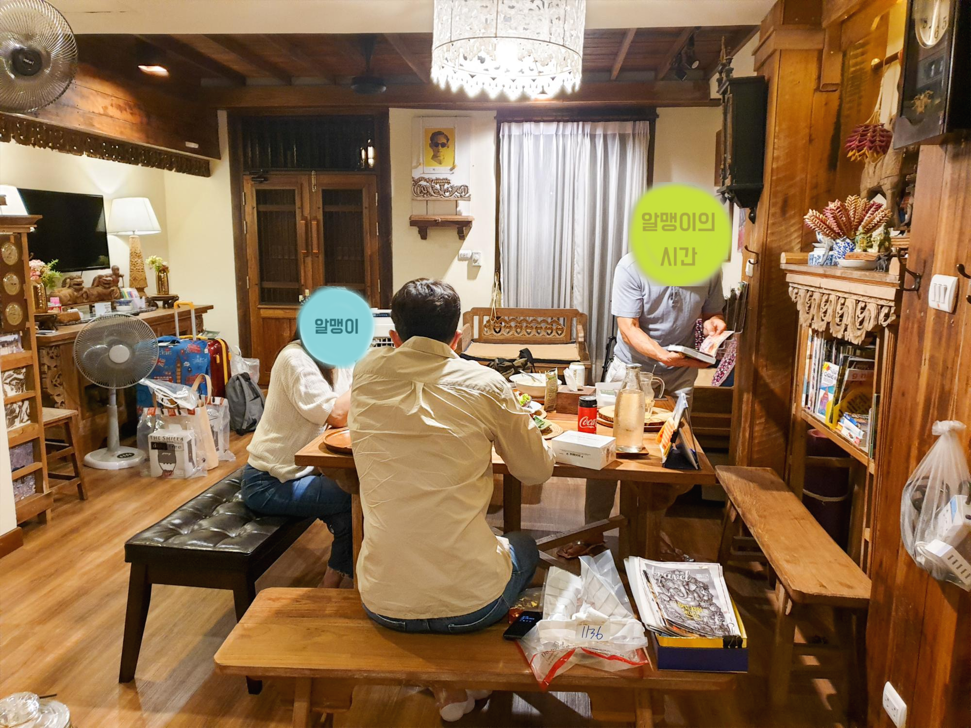 아빠가 앉아 있는 저 티크나무 테이블에서 야식도 먹고 술도 한 잔하고 했습니다. 다만 에어컨이 빵빵한 2층 방들과는 달리 1층 거실엔 에어컨이 설치되어 있지 않았어요. 대신 선풍기가 두 대 있고, 이동식 에어컨(아빠 앞에 있는 하얀색 기계)이 있어서 보완은 됨.