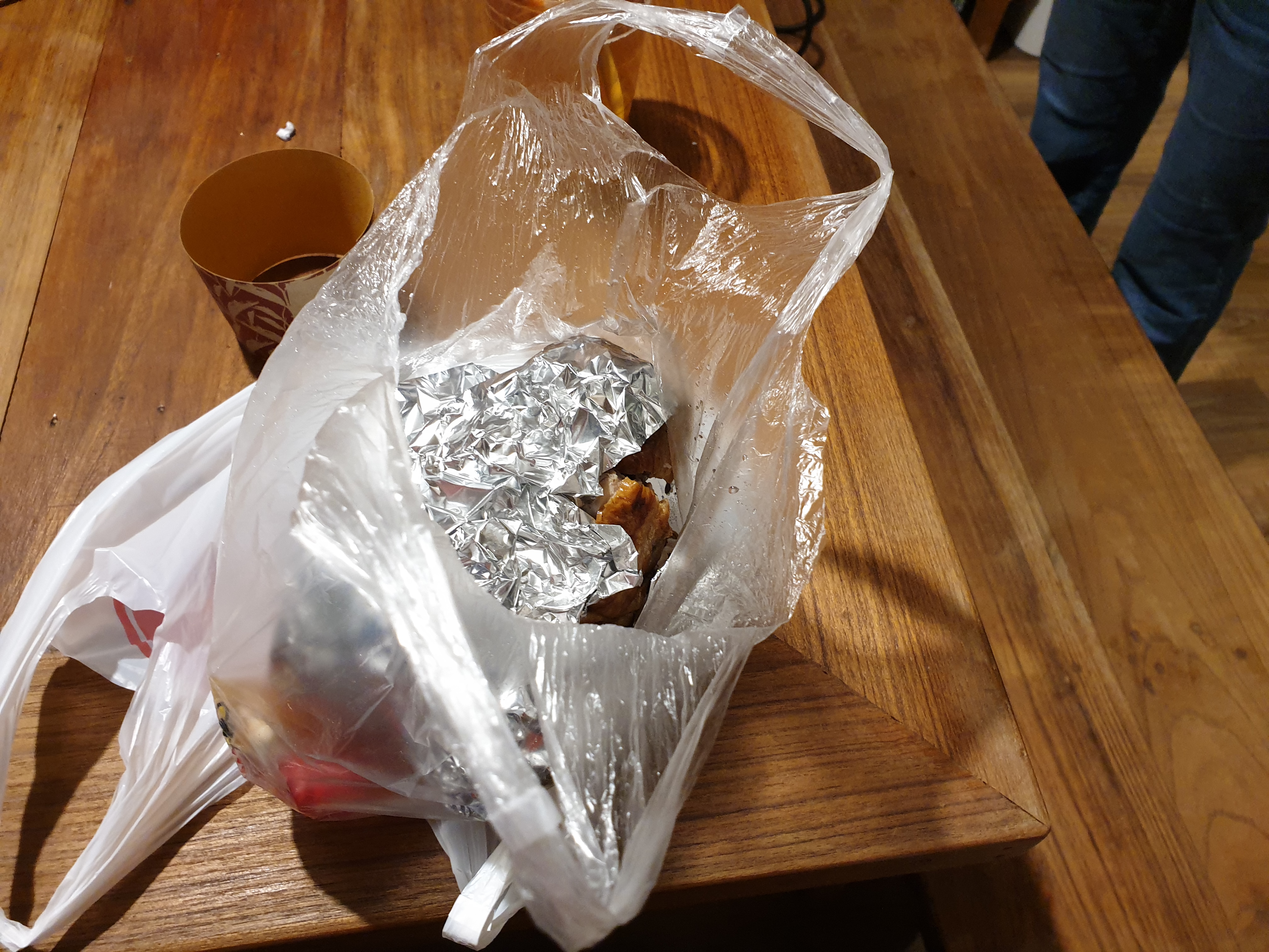 여행 이틀차. 숙소에서 쉬었다 야시장에 가보려는 찰나 동생이 "어? 현관 문고리에 음식 같은거 든 비닐봉지가 걸려있어" 해서 보니 따뜻한 뭔가가 호일에 쌓인채 비닐안에 들어있었다. 우린 배달 음식 시킨 적도 없어서 잘못 배달온건가 하고 그대로 둔 채 외출을 했는데, "혹시...?" 하는 생각이 들어 호스트에게 메시지를 보내보니 자기가 사다 걸어놓은거라고, 깜빡하고 말을 못했네 하는거다.