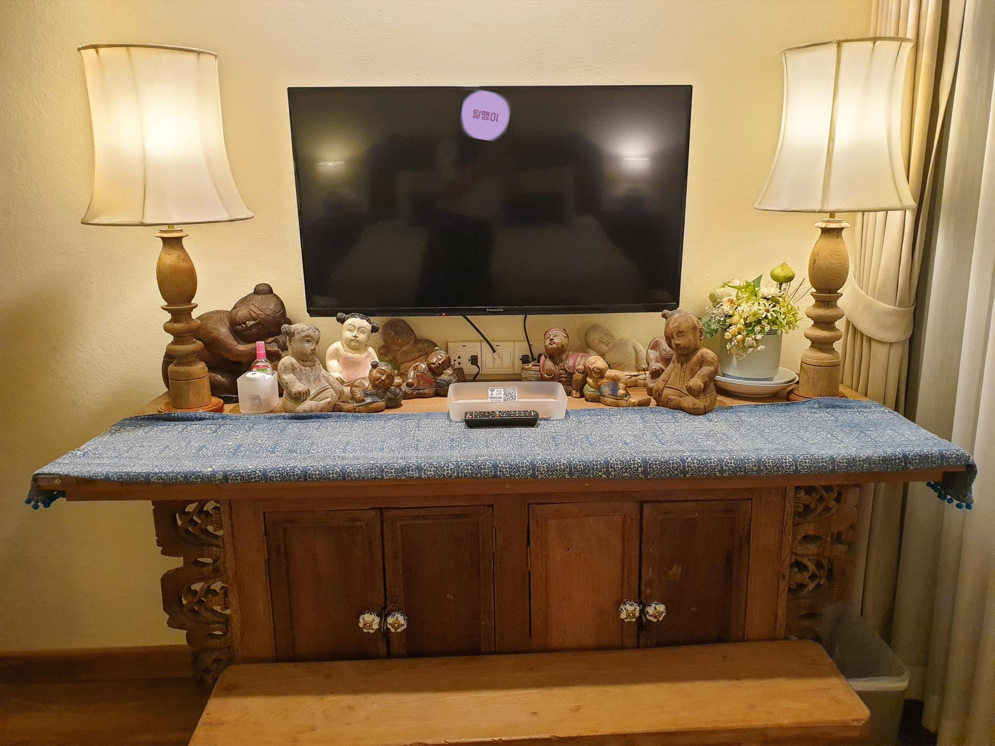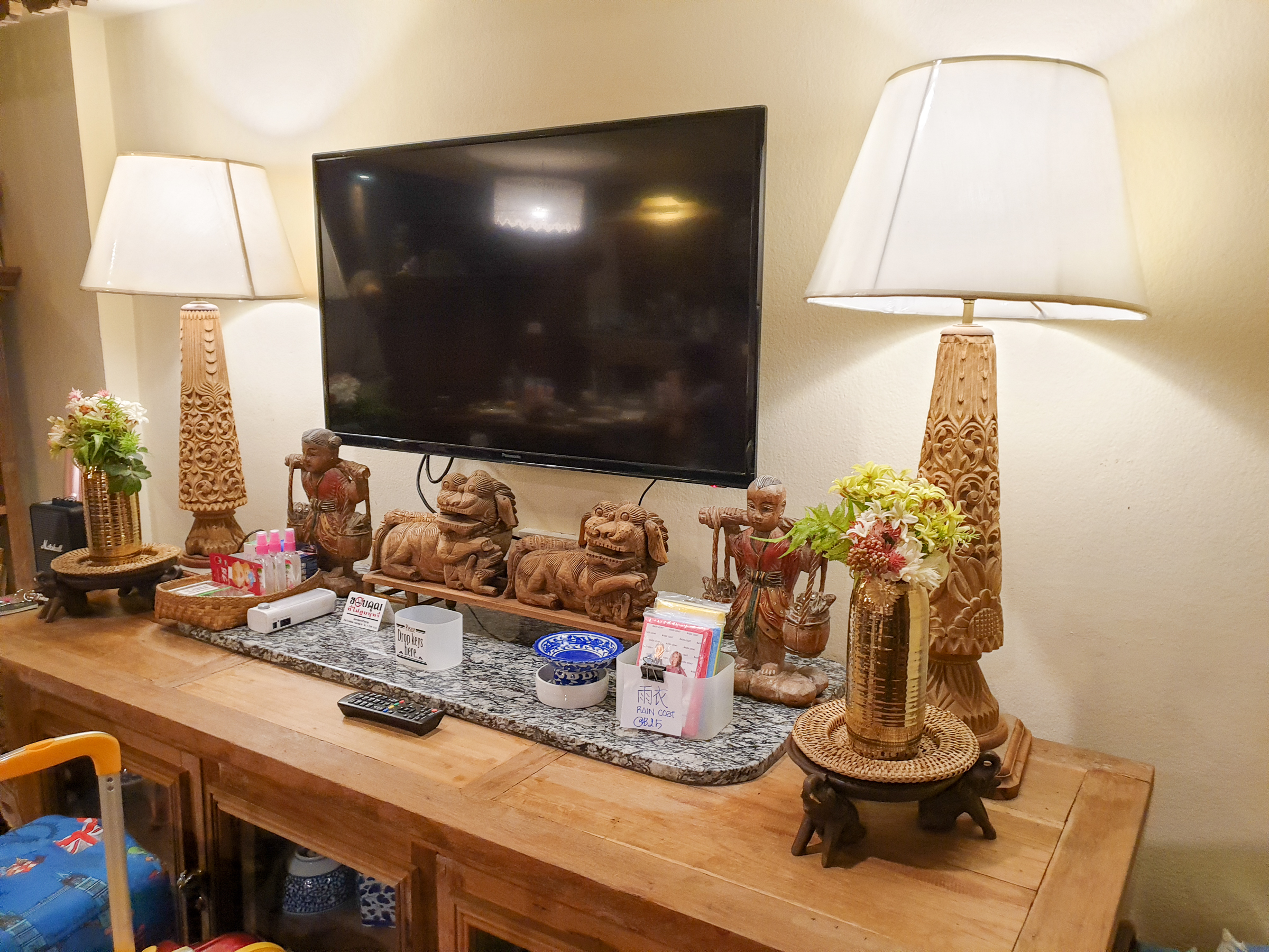거실, 부엌, 화장실1이 있던 1층 모습. 티크 나무로 만든 테이블, 그리고 집주인의 취향이 반영된 각종 목각 장식품들이 집 곳곳에서 분위기를 한껏 업 시켜 주고 있었어요. 사진뿐만 아니라 실물도 예쁜 집! 티비는 1층에 한대, 2층에 두대 총 세대나 있었고, 물론 한국채널은 안나옴 ㅋ 한국 드라마나 예능은 종종 방영했으나 태국어 더빙 ㅋㅋㅋ