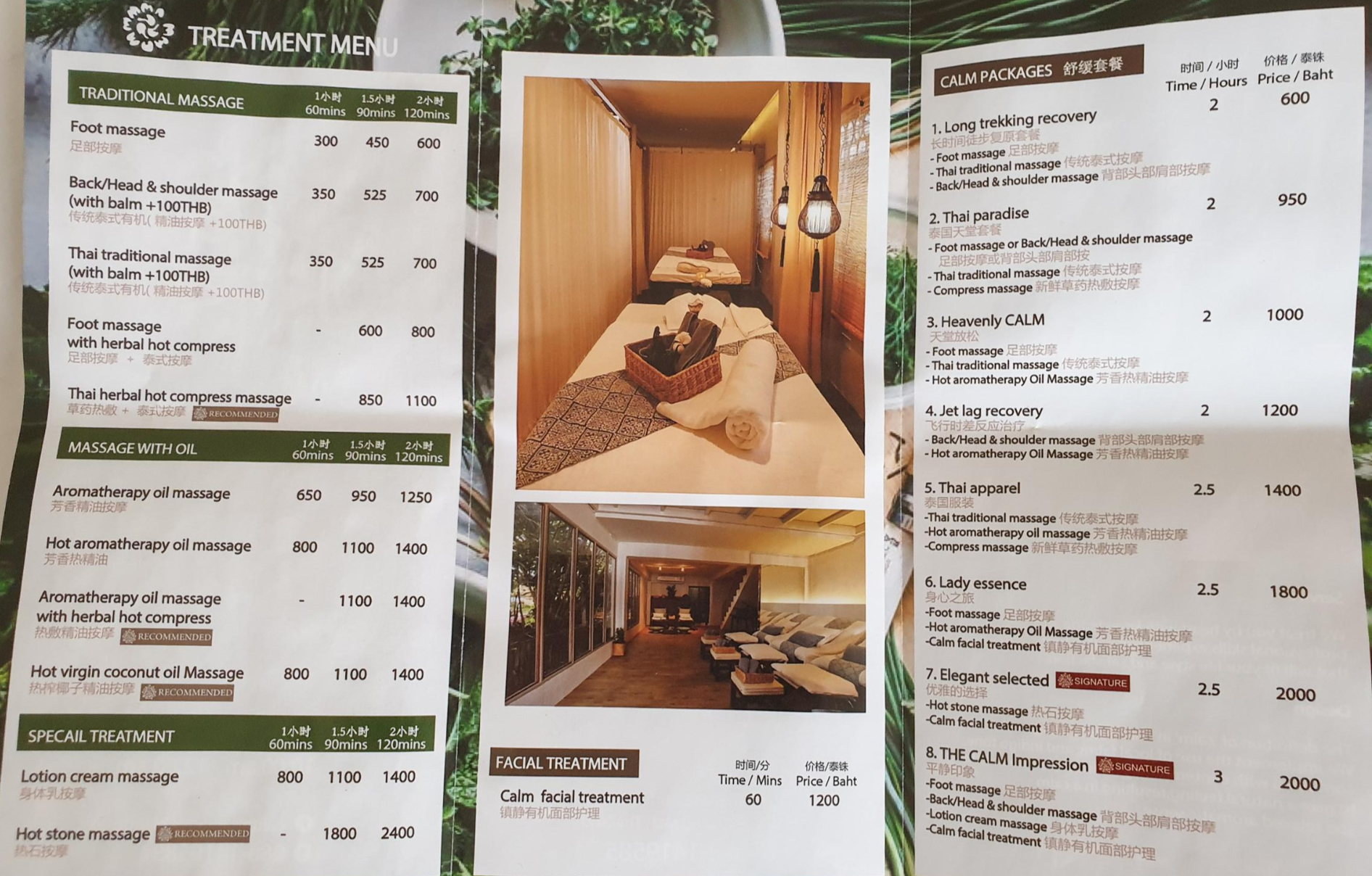 발마사지 한 시간 300바트, 타이 마사지 한 시간 350바트, 등&허리&어깨 마사지 한 시간 350바트 선이었고, 타이+아로마오일+발마사지 2시간 패키지를 800바트로 받을 수 있는 프로모션도 진행하고 있었다. 다른 가격은 위 사진 참고!