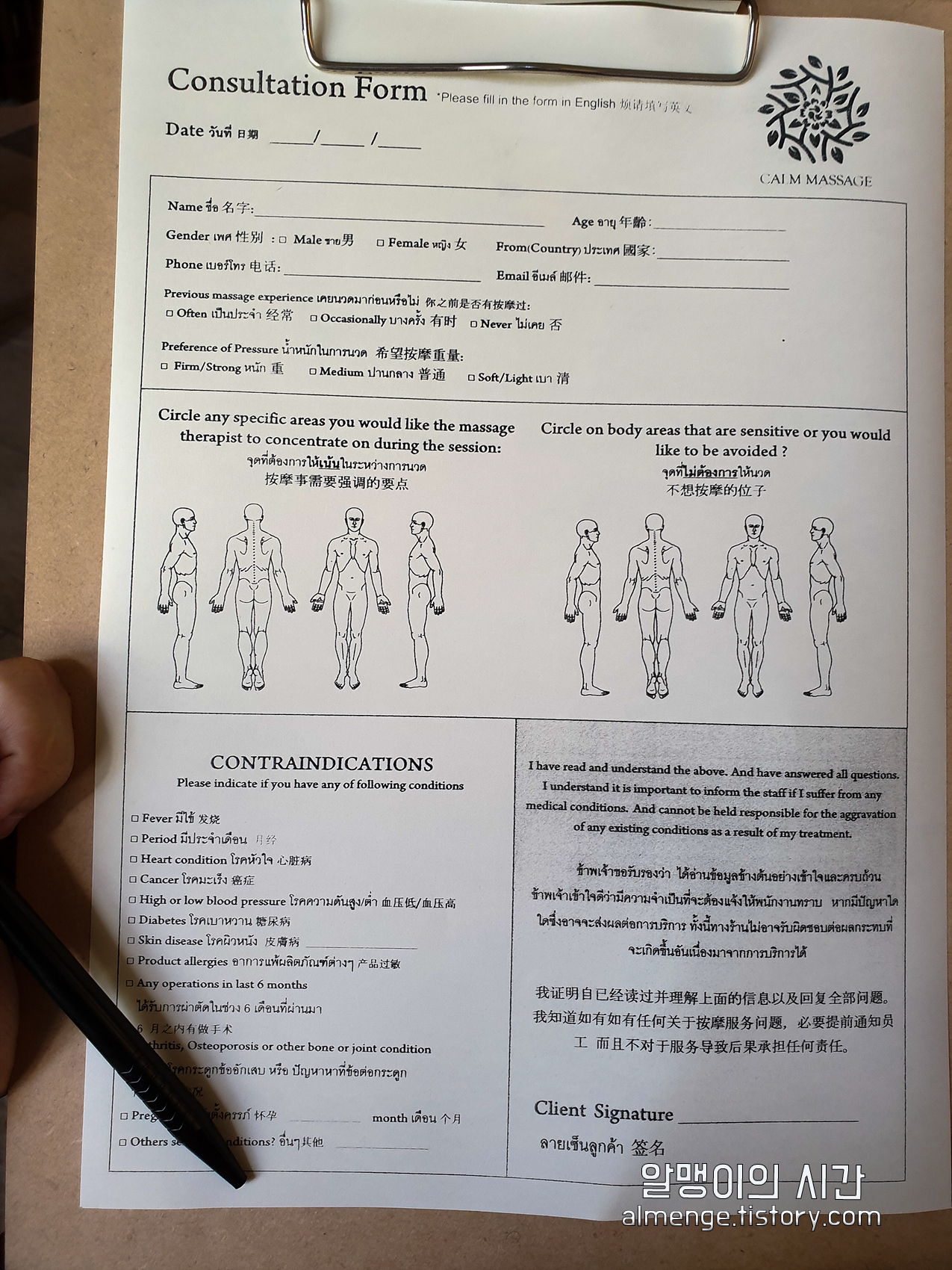 결제를 하고나니 이런 걸 건네준다. 특별히 신경써서 마사지 해주길 원하는 부위, 마사지를 피했으면 하는 부위가 있으면 체크하면 된다.