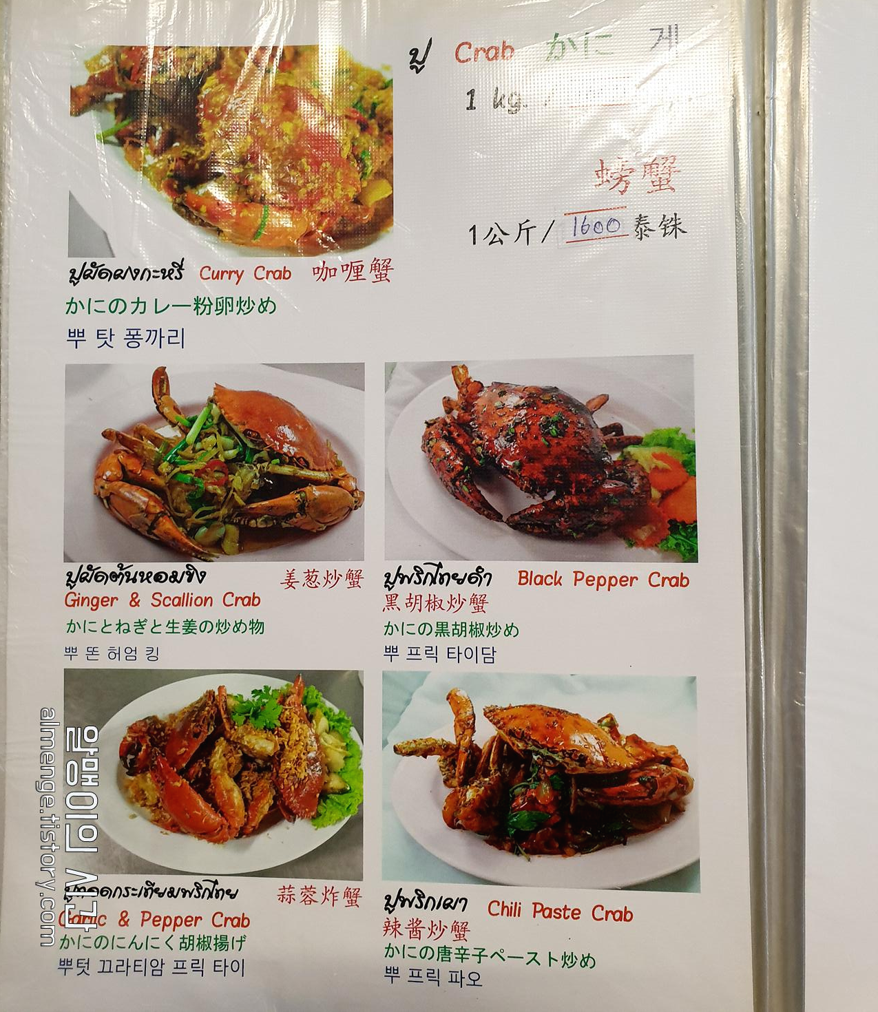 우리는 푸팟퐁커리를 먹으려는 목적으로 이 곳에 왔으나, 사실 여긴 해산물 레스토랑인지라 생선요리, 게요리, 새우요리, 조개요리, 굴요리 등등 엄청나게 많고 다양한 해산물 요리를 취급하고 있다. 메뉴판이 두툼~