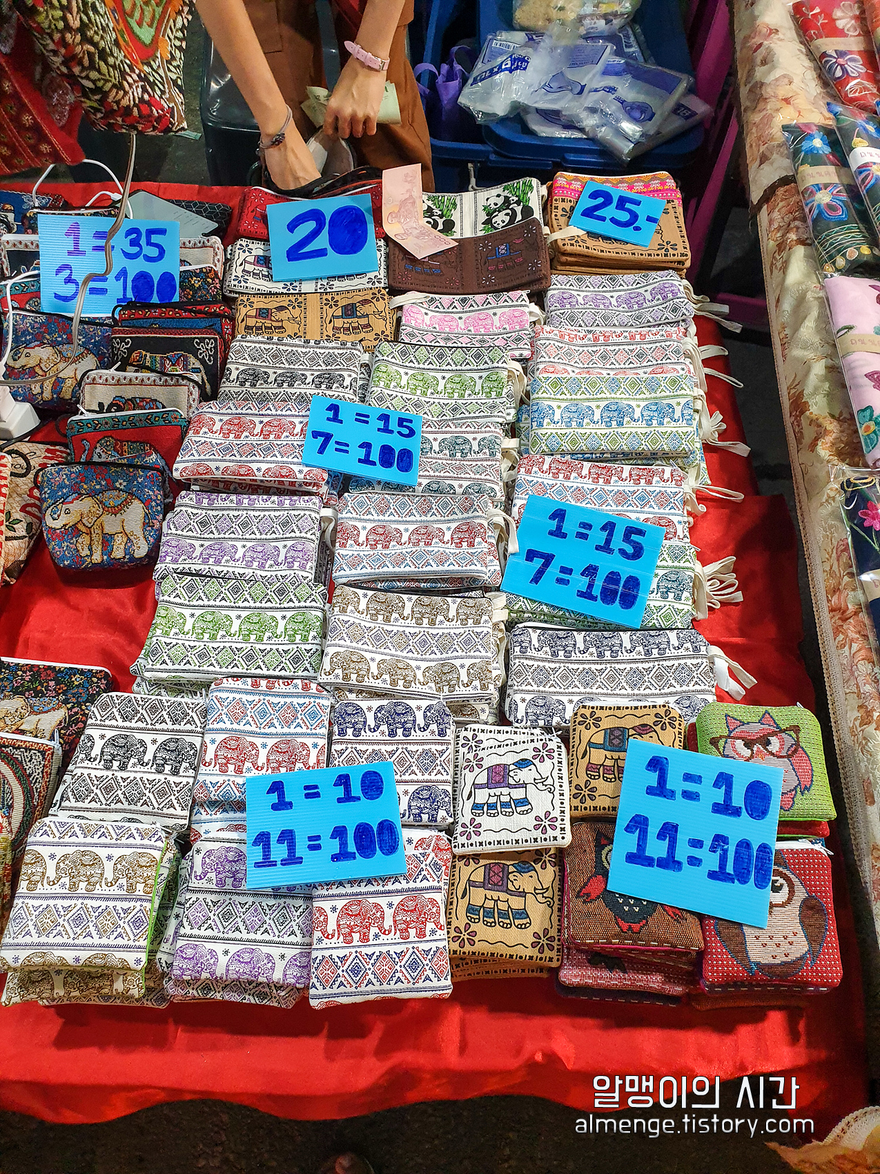 해외여행할 때 지갑으로 쓸 파우치를 찾고 있었는데 때마침 눈 앞에 나타난 태국느낌 충만한 파우치 가게. 태국느낌 팍팍나는 코끼리 무늬가 새겨진 파우치가 단돈 10바트(약 380원)부터 35바트(약 1350원)까지 매우 저렴한 가격에 판매중이다.
