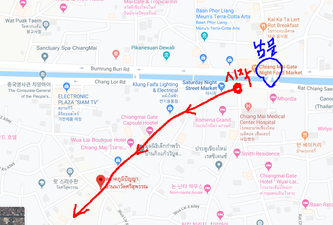 치앙마이게이트에는 매일 열리는 상설 먹거리 야시장인 '치앙마이 나이트 푸드마켓'이 있는데, 여긴 토요 야시장이 아니므로, 토요 야시장으로 가려면 그 푸드마켓을 지나 저 대각선 경로 시작점에 진입해야 한다.