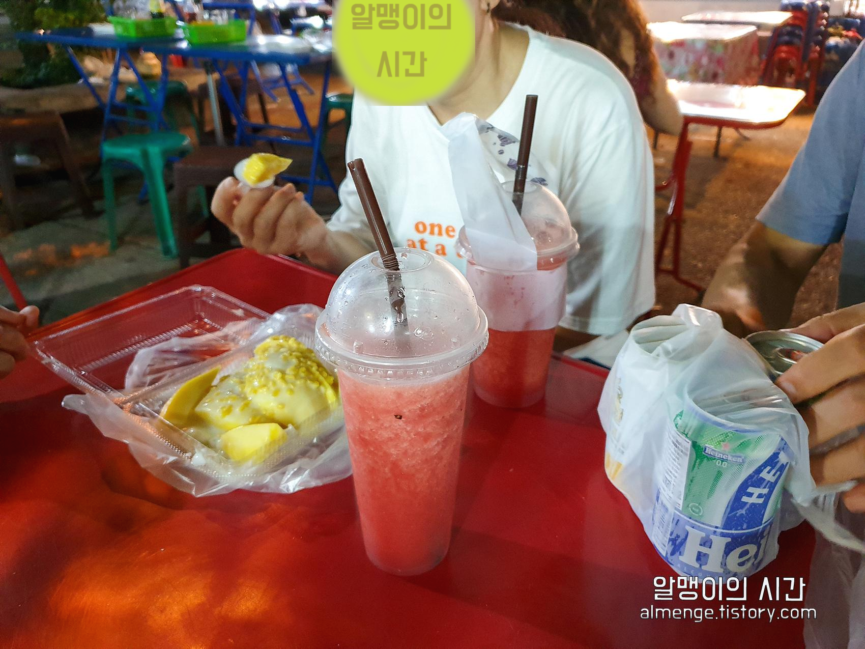같은 야시장 안에 있는 과일주스집인데 가격차이가 났던 현장 ㅋㅋㅋㅋㅋ 아빠까지 땡모반을 사온 덕에 먹어도 먹어도 줄어들지 않는 마법의 주스을(를) +2 획득하셨습니다.