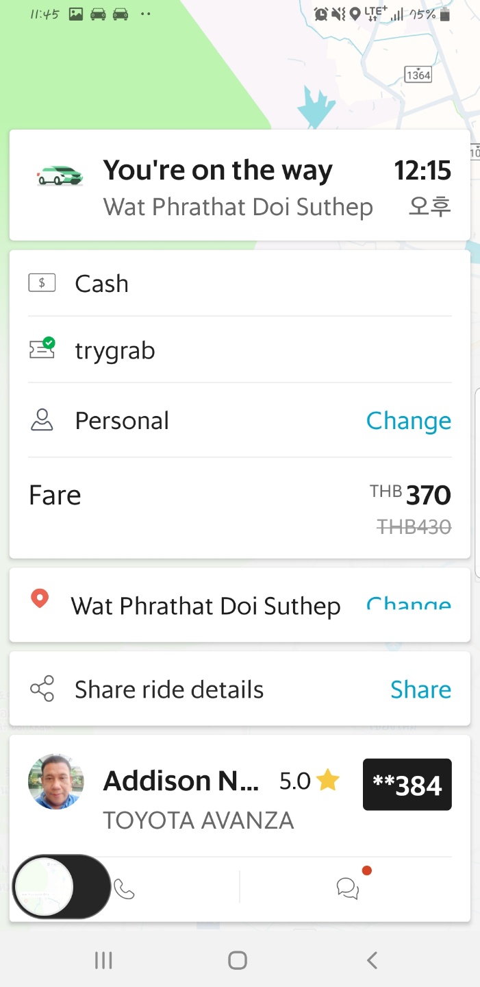아까 그 브런치 카페 앞에서 목적지를 도이수텝으로 찍은 후 그랩을 호출했다. 그랩은 우버같은 공유차량 시스템.