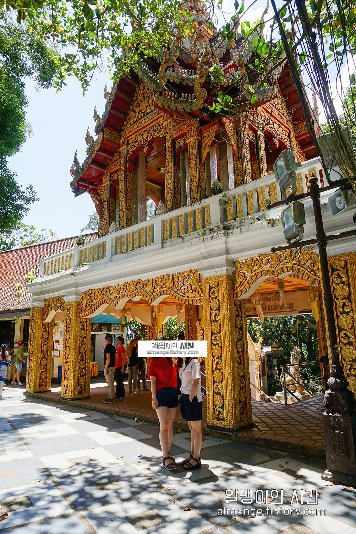 주황빛+금빛 사원과 초록 나무들이 잘 어우러지고, 살랑살랑 시원한 공기까지 더해져 기분이 참 좋았다. 동생이 광각 모드로 찍어준 엄마랑 나 사진 ㅋㅋㅋㅋ 광곽 왜곡 효과 덕에 롱다리를 얻었다.