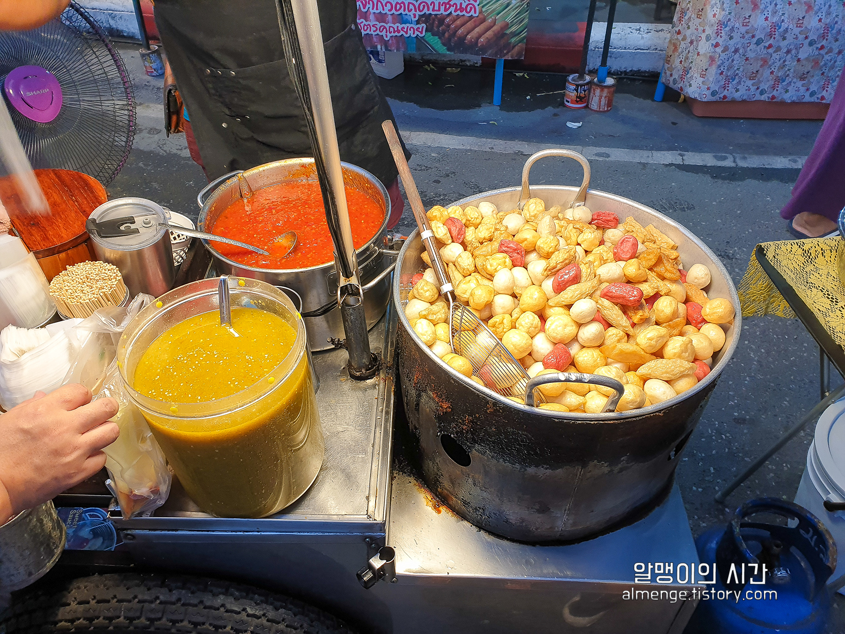 그래도 시장에 왔으니 간식거리 하난 사먹어줘야 할 것 같아 이미 배는 불렀지만 오뎅을 주문했다. 비닐봉지에 오뎅을 한 가득 담아주고, 두 가지 소스 중 원하는 소스를 말하면 비닐 안에 한 국자 퍼서 넣어준다. 우린 빨간색 달콤한 칠리소스로 선택!