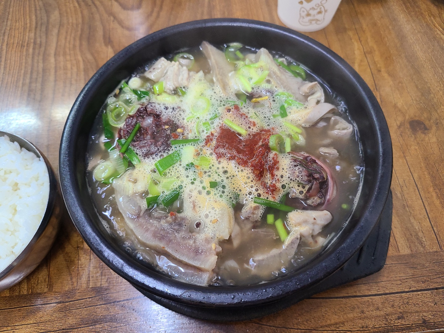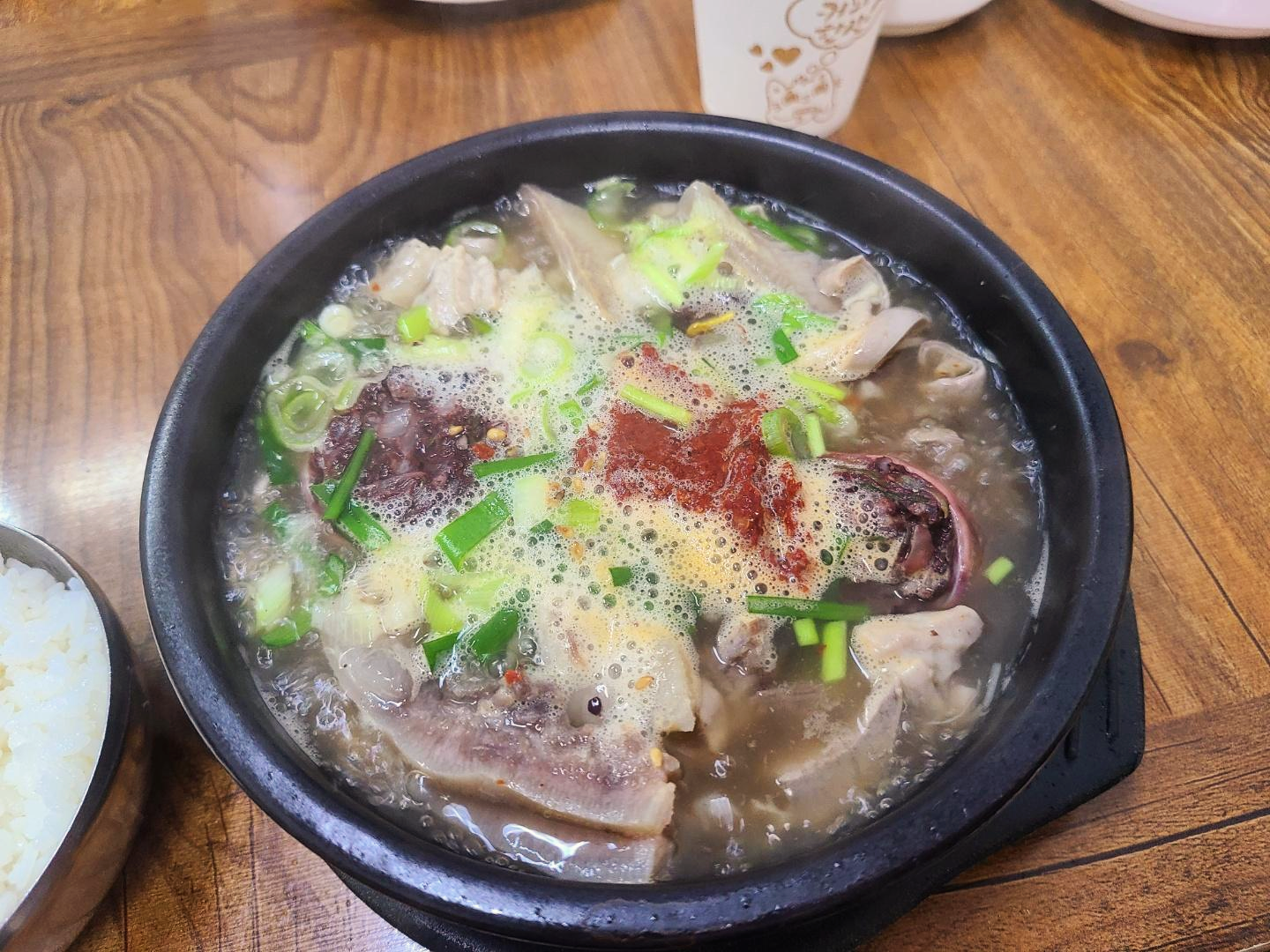 다데기를 섞기 위해 숟가락으로 한 번 휘 저었는데 딸려온 저 어마어마한 돼지내장 건더기들 ㅎㅎㅎ 프랜차이즈 국밥집에서는 느낄 수 없는 푸짐함에 기분이 좋았어요.