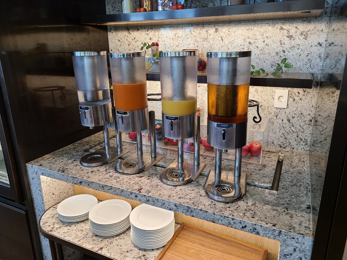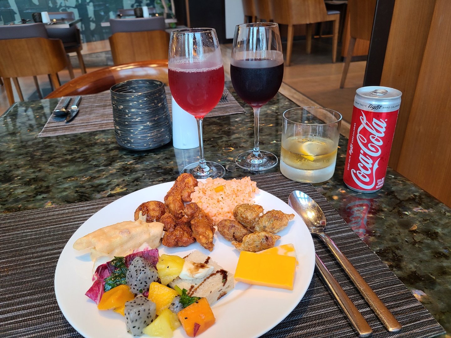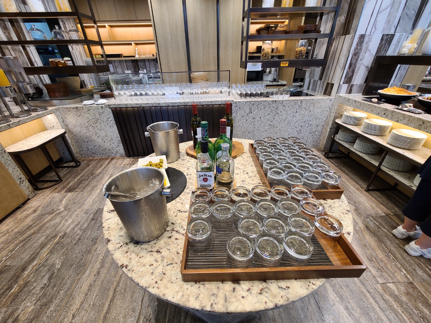 코로나 때문에 라운지 이용장소나 시간이 조금 변경되었더라구요. 원래 라운지는 꼭대기층인 15층이고, 해피아워 이후로도 주류나 간단한 스낵은 이용할 수 있었던 걸로 기억하는데, 코로나로 인해 라운지 뷔페는 15층이 아닌 1층 가든키친으로 바뀌어 있었고, 주류도 해피아워 시간인 17:30-19:30 에만 이용이 가능했어요.