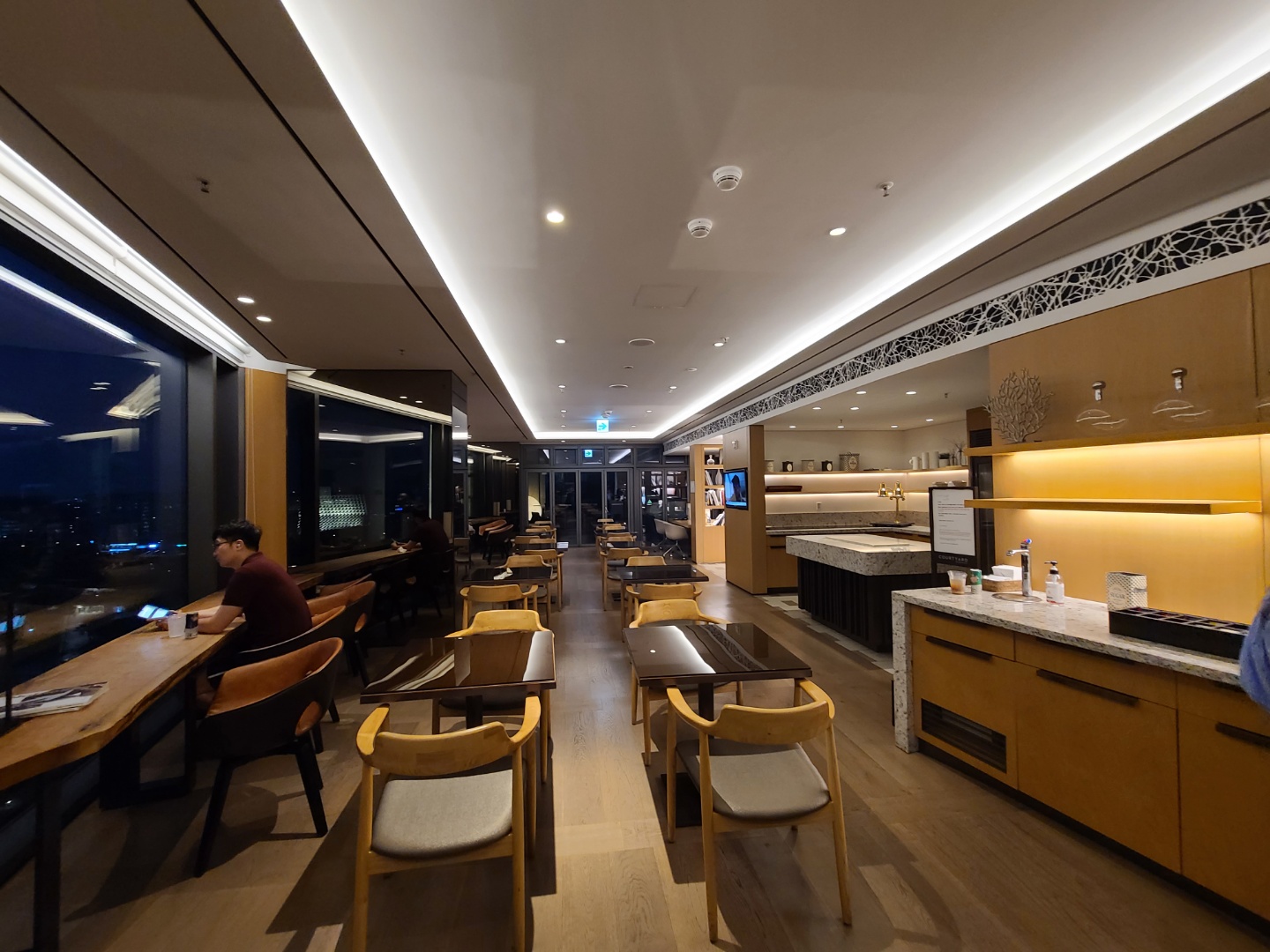 저녁 먹고 엄마랑 방에 있다가 심심해서 15층 라운지에 올라와봤어요. 제가 갔던 기간엔 15층 라운지에선 해피아워나 조식이 진행되지 않아서, 밤 11시까지 커피, 차 등만 이용가능한 공간이었어요. 그래서인지 사람 거의 없이 조용했던