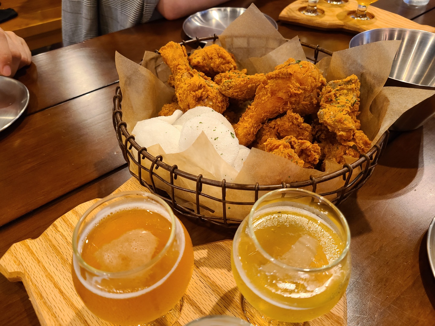 이제 끝내고 가려는 가이드님 붙잡고 안주를 추천받았습니다 ㅋㅋ 금강산 위트에일에 24시간 숙성시켜 만들었다는 프라이드 치킨으로 픽!