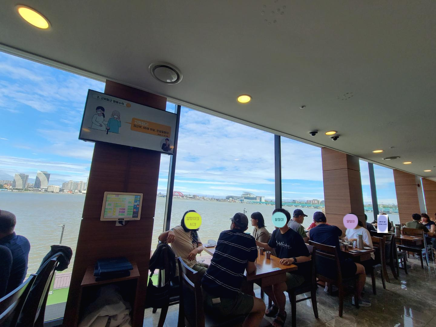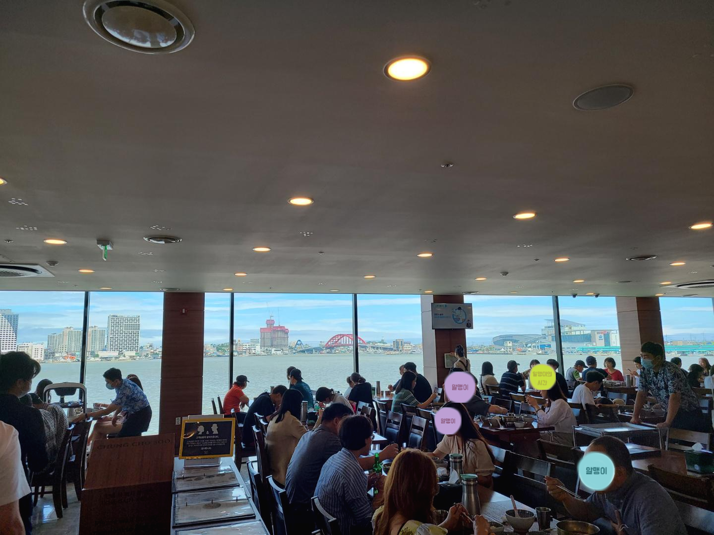 우린 4층으로 안내받았어요. 통창 너머로 보이는 청초호가 멋지네요. 창가 자리에 앉으려면 내부에서 또 따로 줄서서 기다려야 한다길래 우린 그냥 안쪽 자리에 앉았어요. 밖에서 줄서고 뭐 안에서도 줄을 서냐며 ㅋㅋㅋㅋ