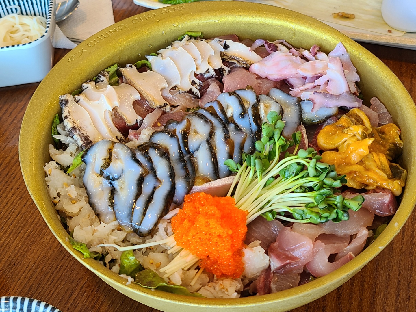 보시다시피 해삼과 활전복을 메인으로 하고 그밖에 몇 가지 생선회, 멍게, 날치알, 채소가 듬뿍 올라가 있었고 아래엔 육수가 깔려 있었어요. 비주얼은 합격!