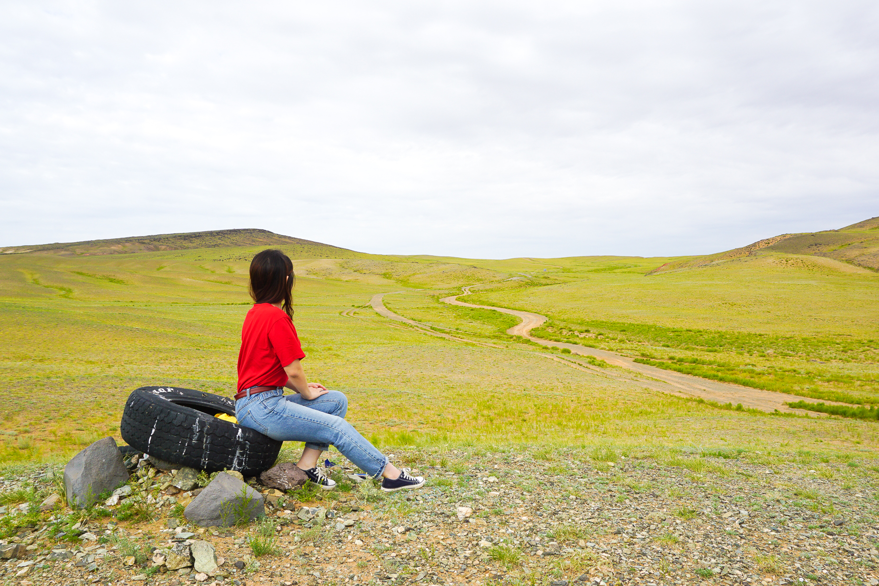 오늘은 화성을 닮은 붉은 땅 바얀작으로 이동하는 날! 가는 길에 이런 예쁜 초원에서 사진도 남겨본다. 조금의 불편함만 감수한다면 이런 인생샷 다량 생성 가능한 몽골!
