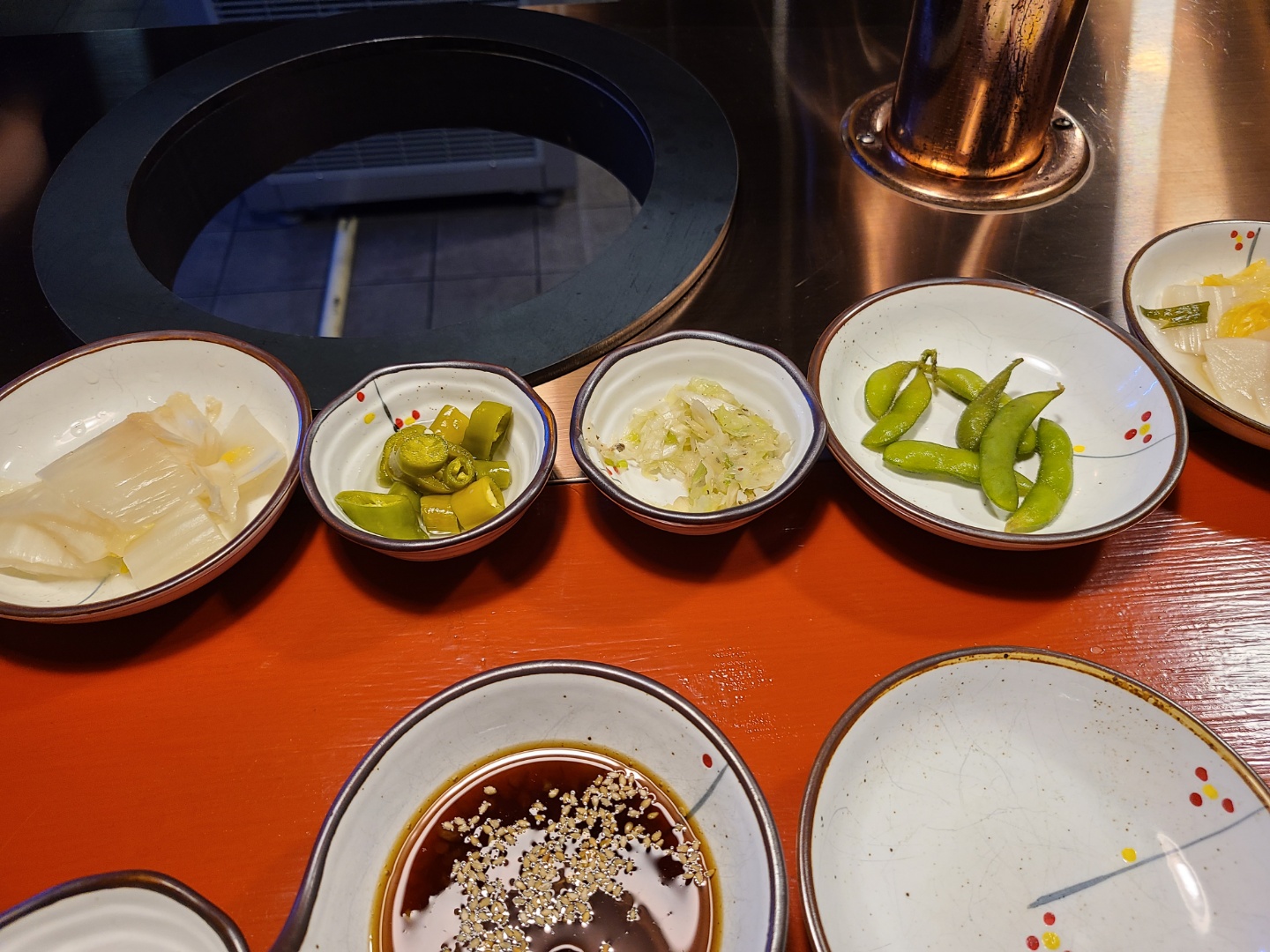 다른 건 보이는대로고, 고추 장아찌랑 완두콩 사이에 있는건 파소금이에요. 등심과 함께 먹으면 궁합이 잘 맞다고 함(직원피셜)