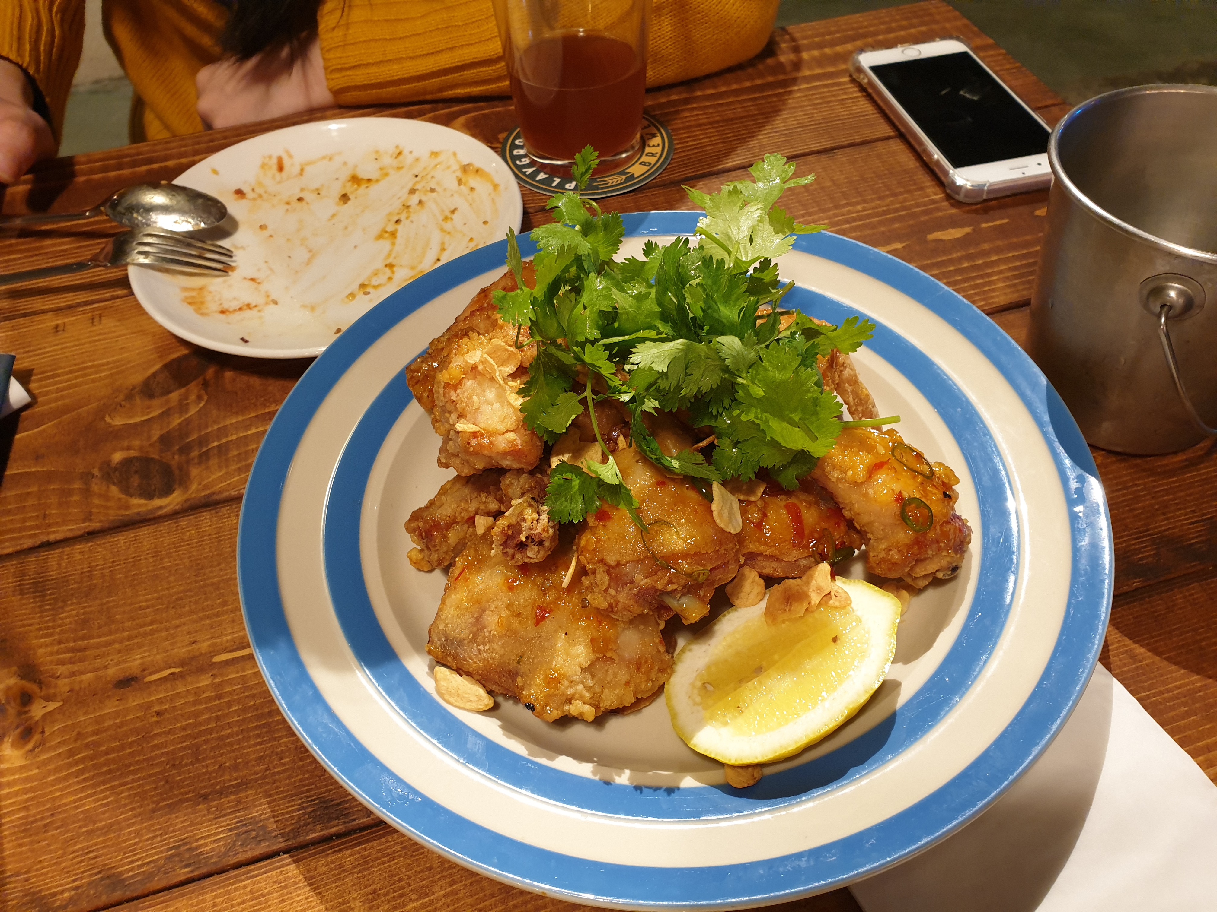 이렇게 고수 듬뿍 얹은 치킨이 나오더라구요. 고수 싫어하시면 고수는 살짝 옆으로 옮겨두고 드시면 돼요.