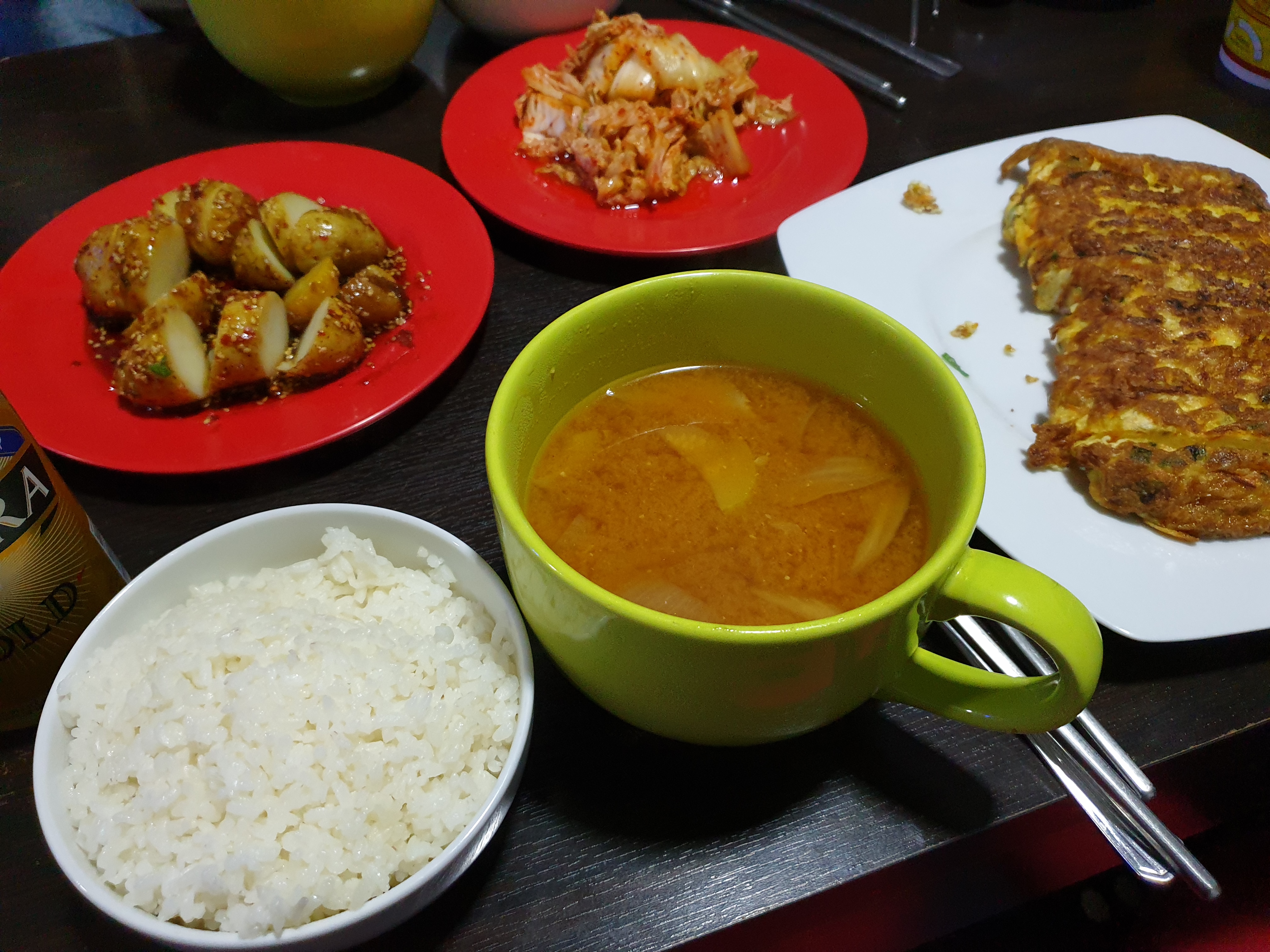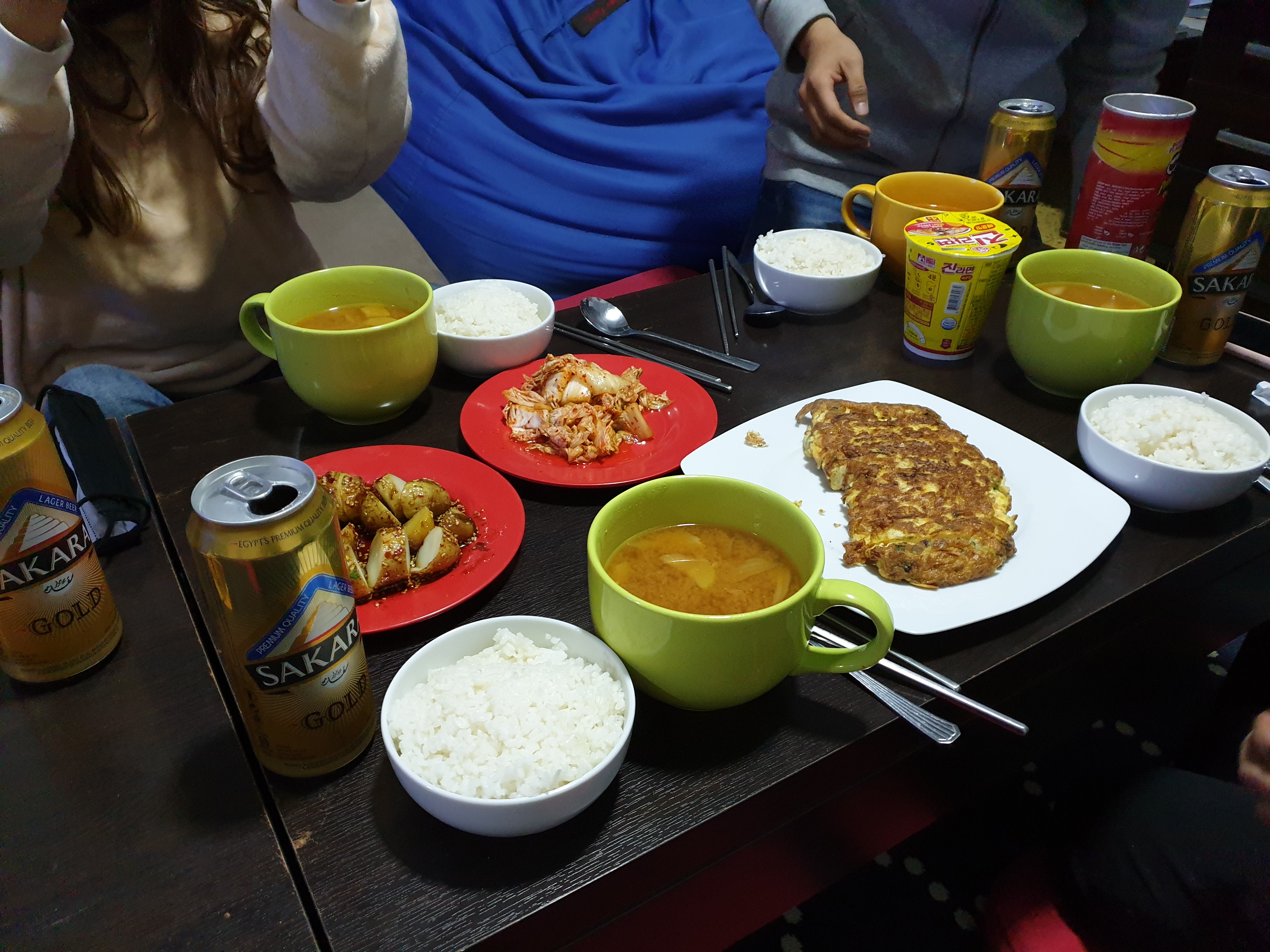 김치, 계란말이, 감자조림, 된장국, 쌀밥을 뚝딱 차려주셨다. 이렇게 차려주시는데 밤12시라고 어찌 안먹을 수 있나 ㅠㅠ 특히 저 김치는 이집트 열악한 환경에서 직접 담그신거라고!