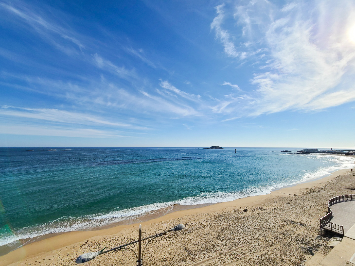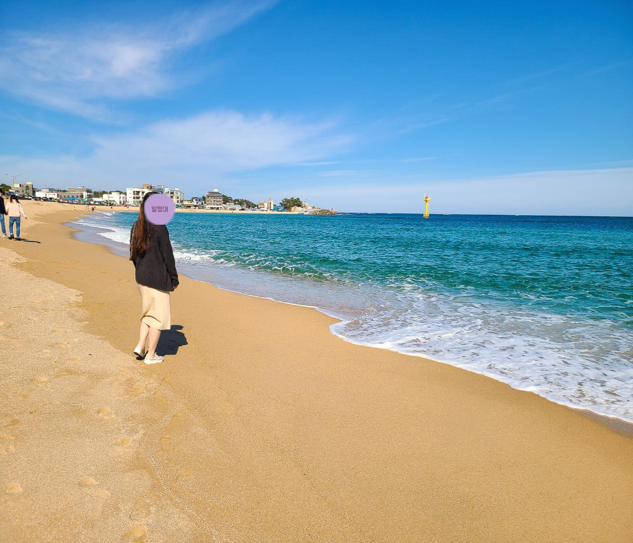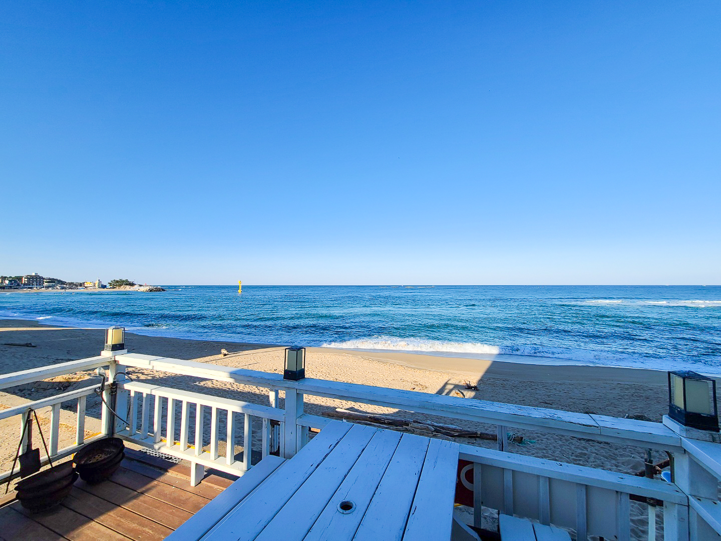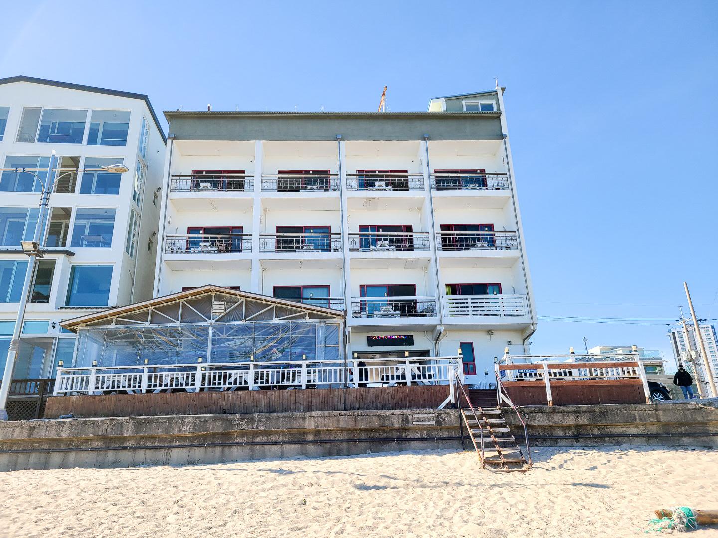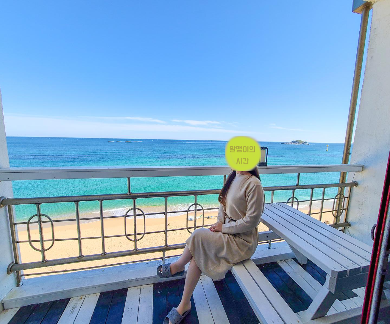 바다가 저 멀리 쪼그맣게 보인다던가, 앞엔 건물이고 측면에 살짝 보인다던가 하는 경우가 많은데 여긴 레알 해변 모래사장 바로 앞이라 바다가 시원시원하게 보이는게 마음에 들었어요.