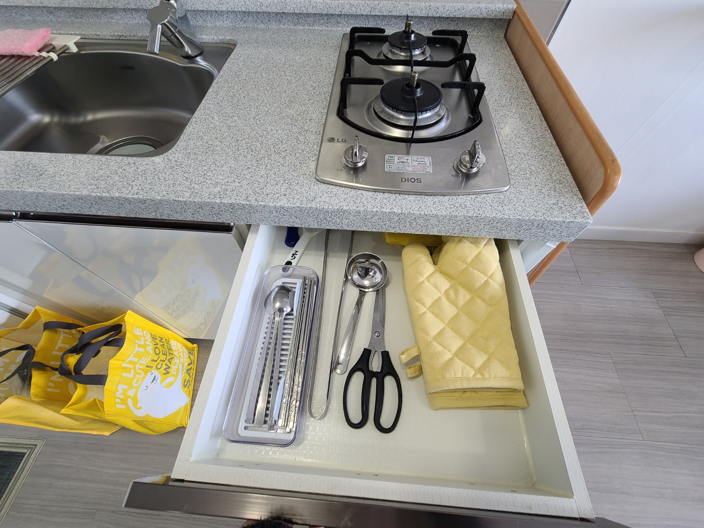 간단하게 취사 가능한 도구들, 가스렌지, 냉장고도 구비되어 있습니다. 요리할 때 필요한 조미료 같은건 딱히 없었는데 식용유는 있었어요. 사진엔 없지만 냄비도 세 개 정도 있었음.
