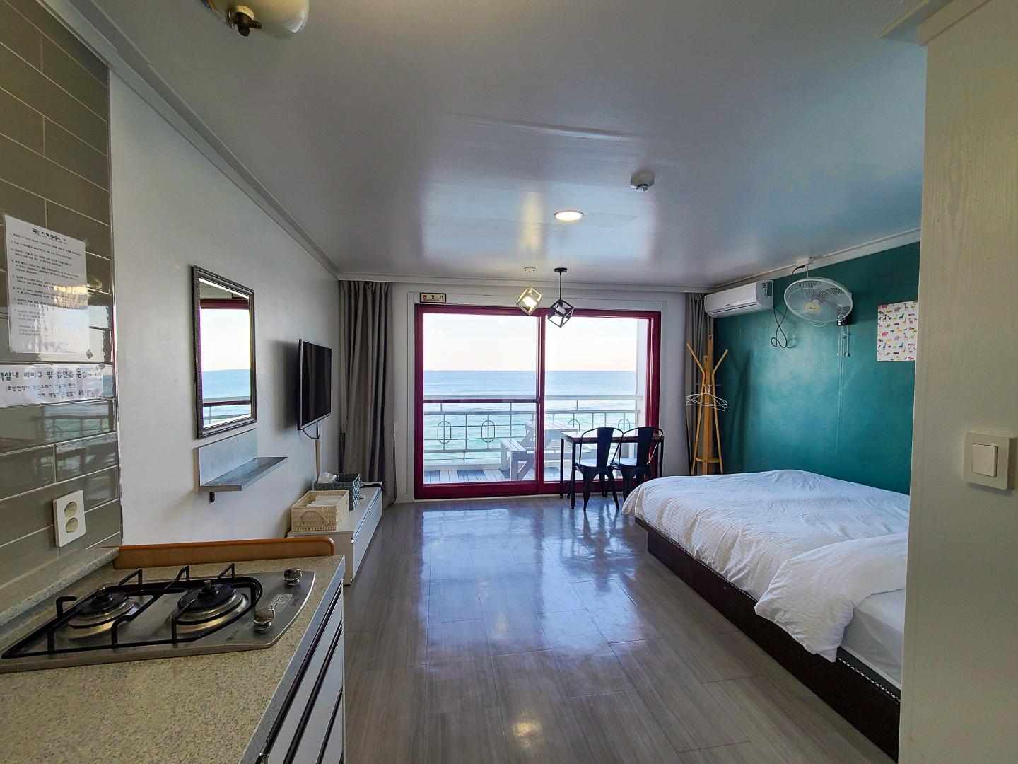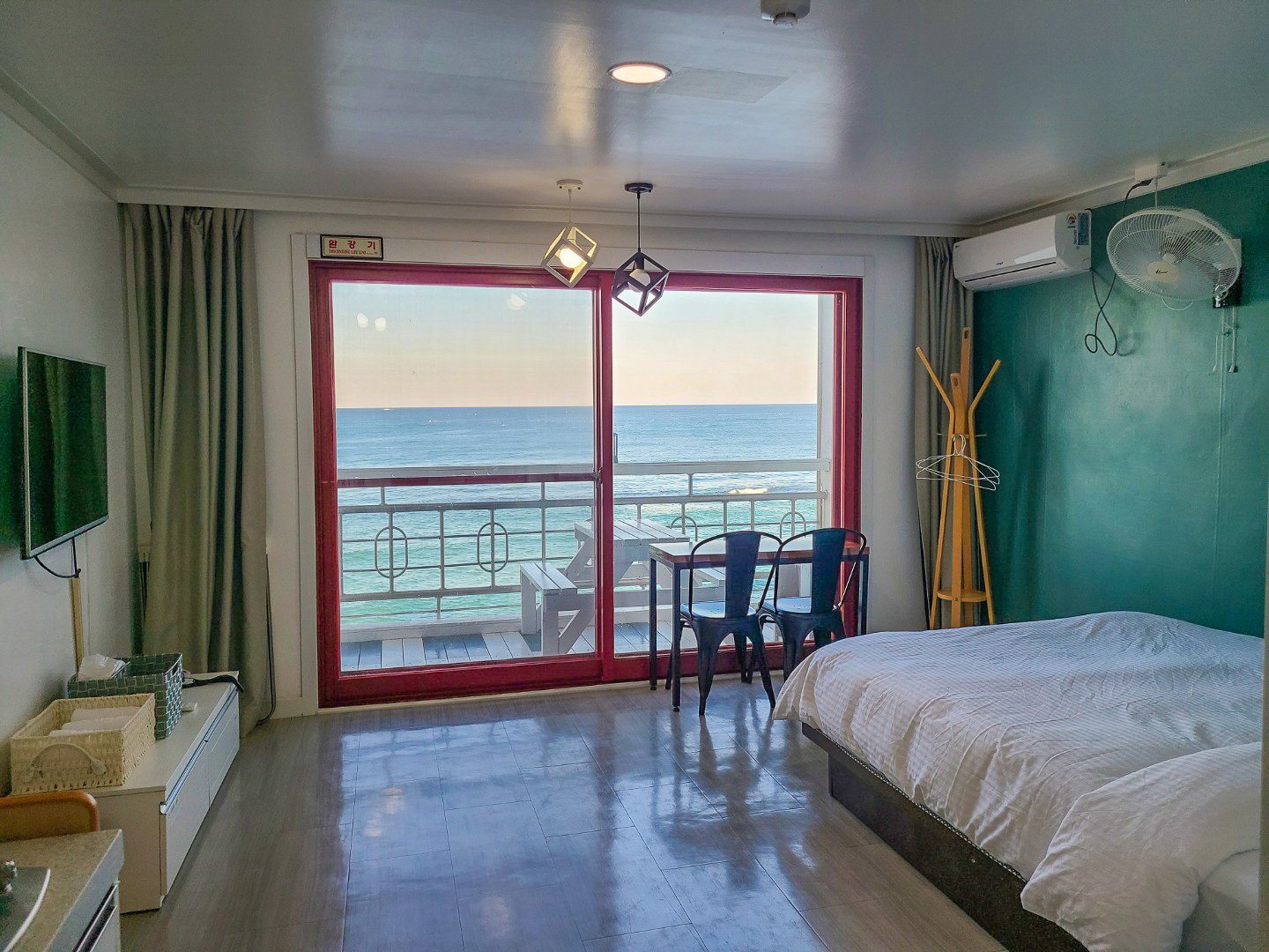 그래도 창문 가득한 오션뷰가 반겨주는 404호방. 엘베 없이 계단으로 올라왔더니 숨이 좀 차긴 했지만 방문을 열자마자 시원하게 펼쳐지는 오션뷰에 감탄하며 들어왔어요.