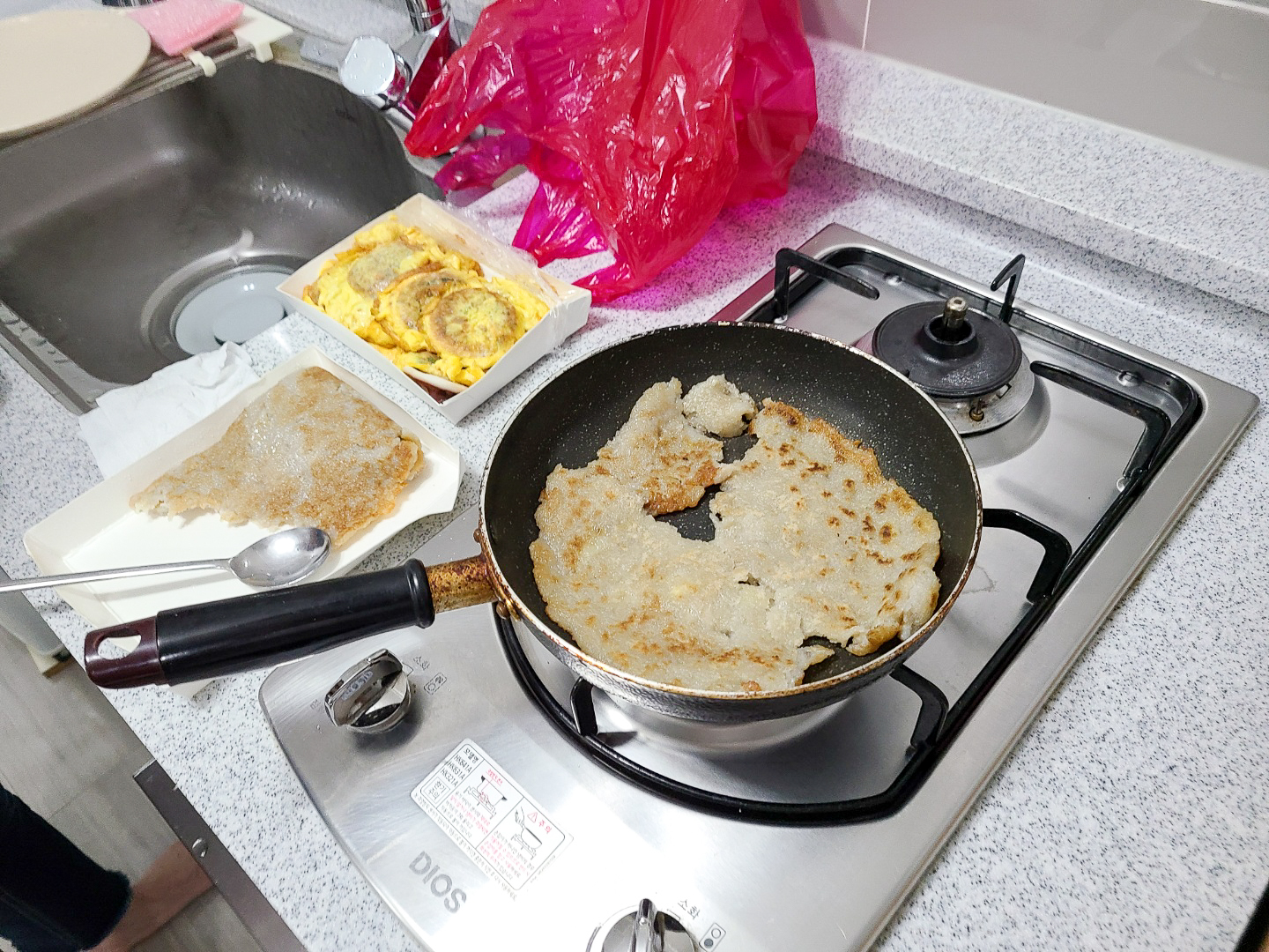 우리도 속초 중앙시장에서 사온 오징어순대와 감자전을 후라이팬에 데워 뜨끈하게 먹었습니다.