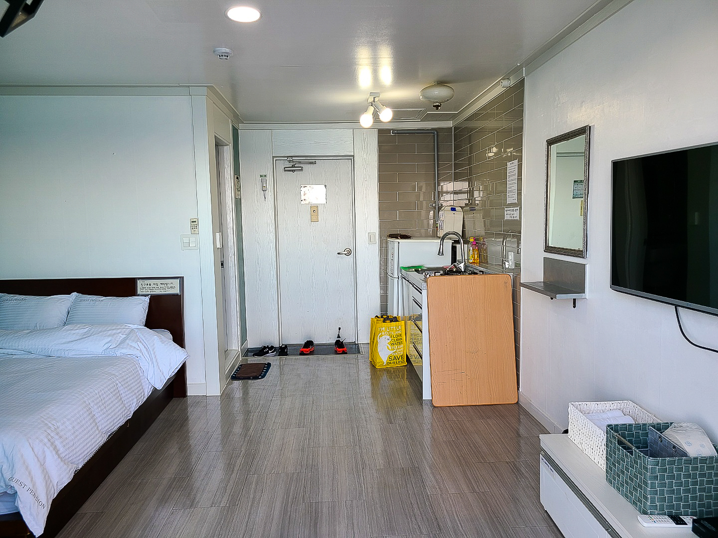 원룸형 방이라 방이 크진 않아요. 침대 옆에 이불깔고 하면 네 명정도까진 숙박 가능할 것 같아요.