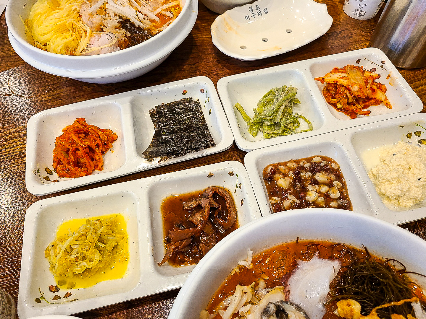 일반 물회는 전복과 해삼이 들어가지 않아요. 엄마는 생전복 별로 안좋아하셔서 일반 물회로 주문! 몇 가지 종류의 회가 세꼬시 스타일로 올라가 있었어요. 회 외에 해산물은 문어, 멍게 등이 조금 있었어요.
