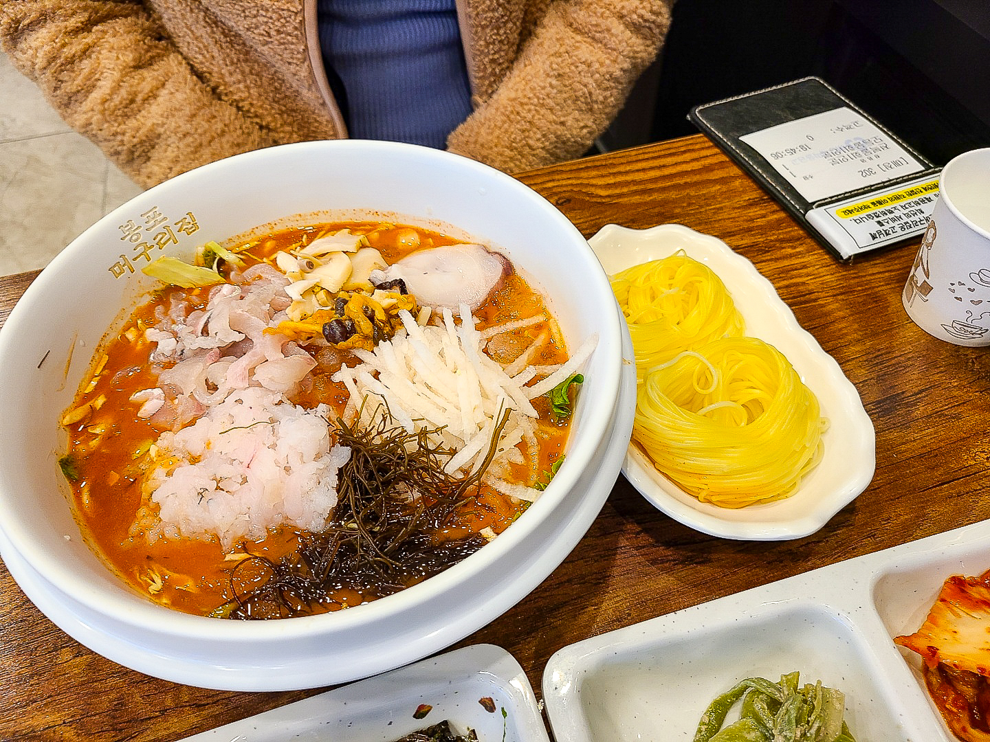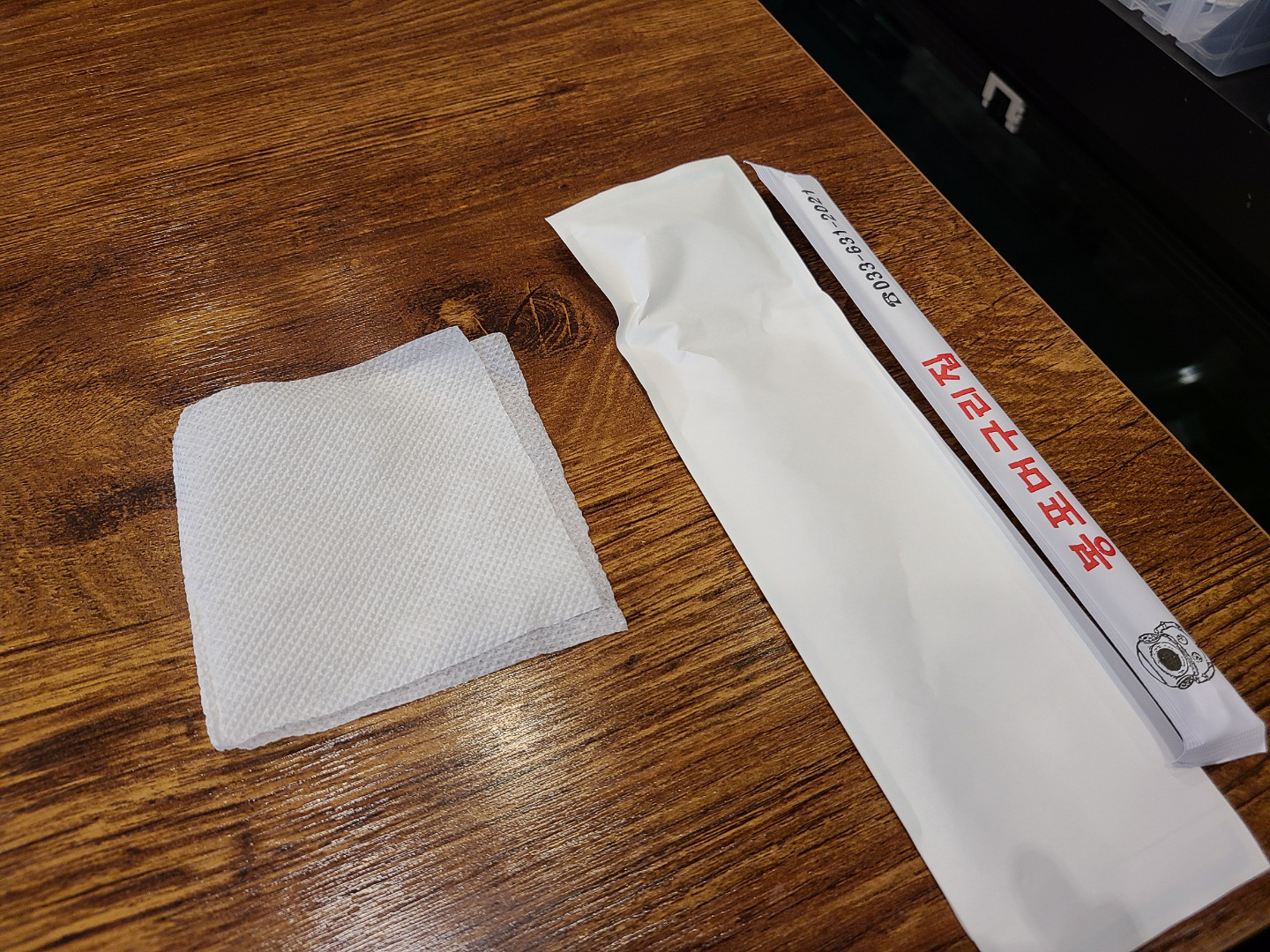 컵과 젓가락은 일회용으로 제공되었고, 숟가락은 일회용은 아니었지만 이렇게 종이포장 된 상태로 테이블 아래 서랍에 들어있었어요.