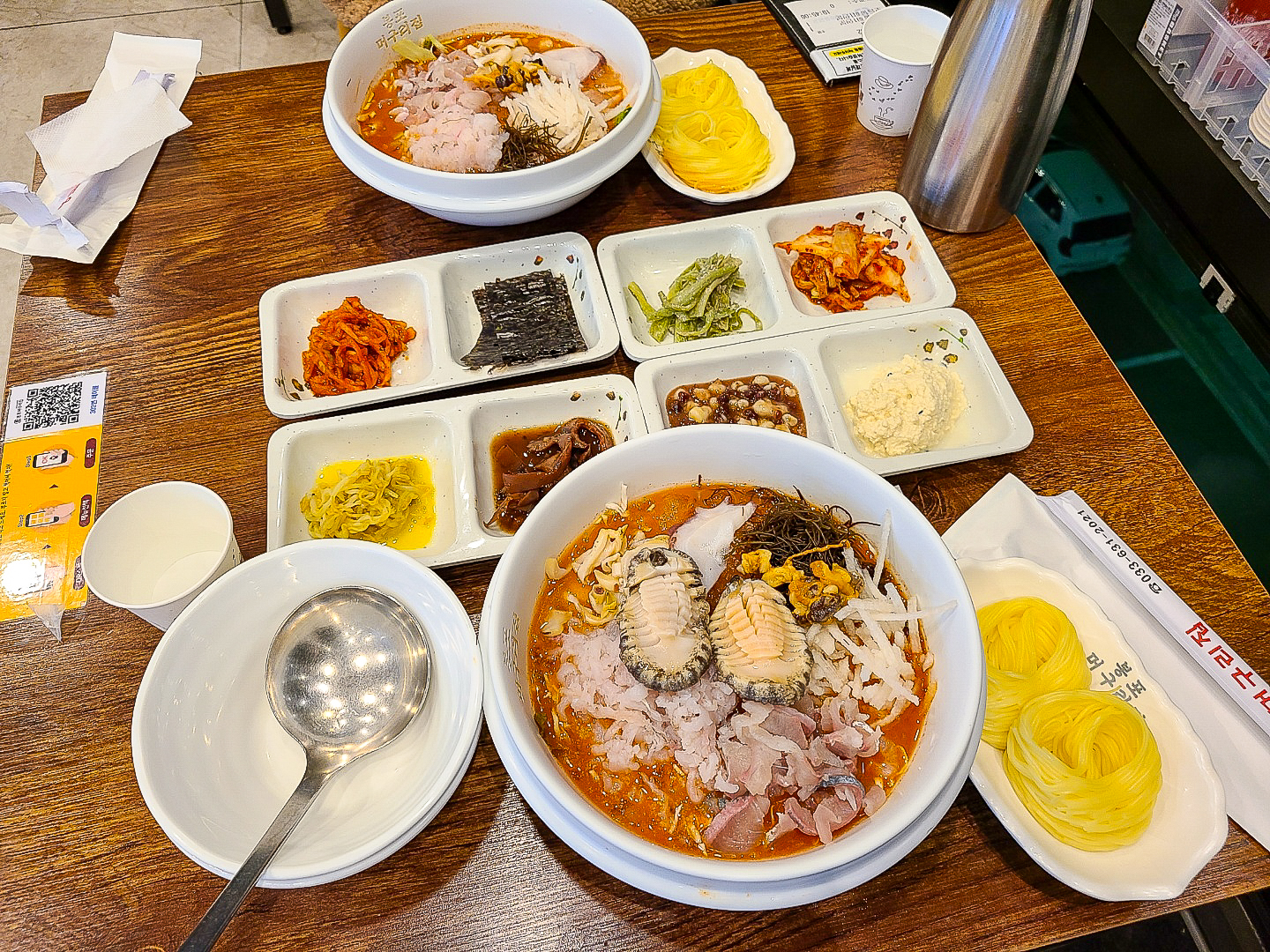 예전의 청초수물회와 봉포머구리집은 각각 어땠는지 모르겠지만 커다란 신관건물을 짓고 난 후에는 놀라울 만큼 시설이나 서비스가 비슷했어요. 기업을 연상케 하는 커다란 건물을 올린 것도 그렇고, 안에 엘베 있고, 같은 건물에 카페가 있고, 바다옆이라 오션뷰인 것, 심지어 서빙로봇이 서빙하는 것까지 모두 같았어요.