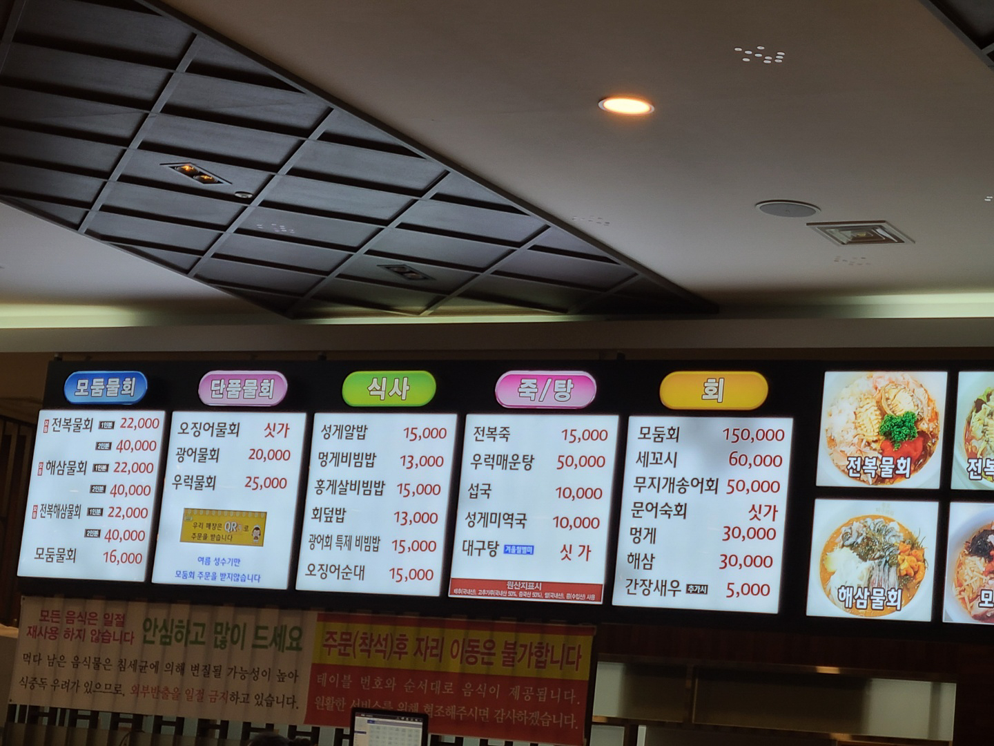 전복물회, 해삼물회, 전복해삼물회는 1인분 22000원, 모둠물회는 1인분 16000원, 광어물회는 1인분 20000원, 우럭물회 25000원 선이었고, 물회메뉴 외에는