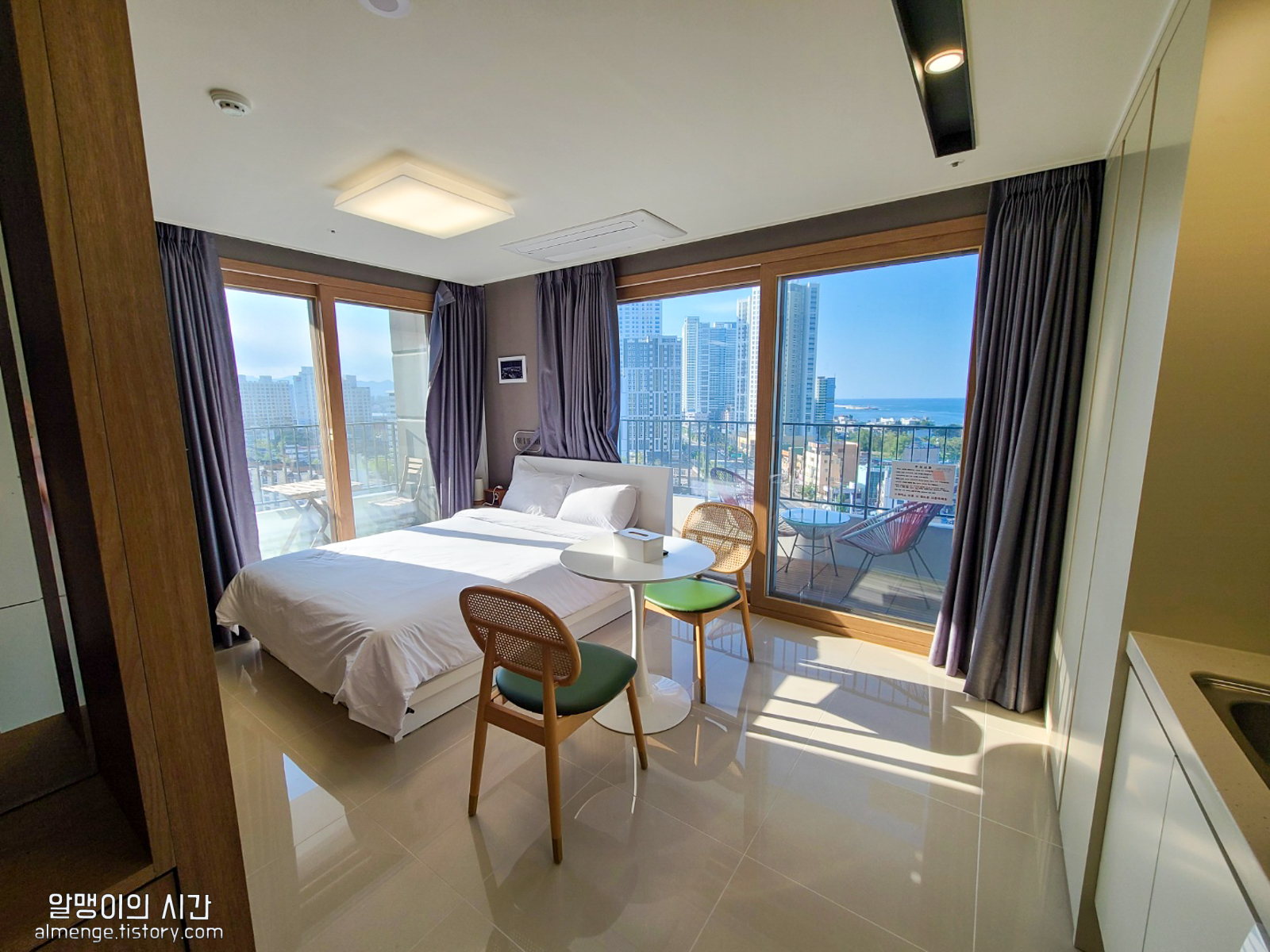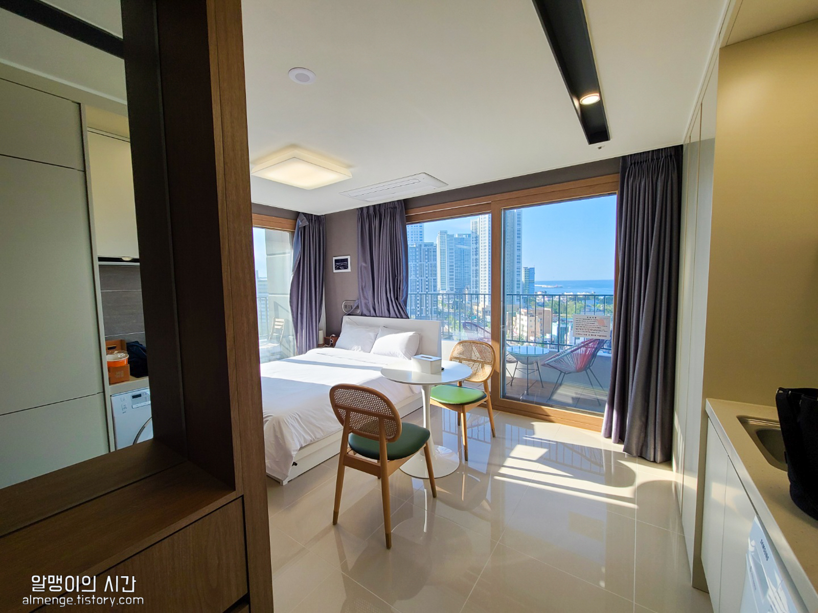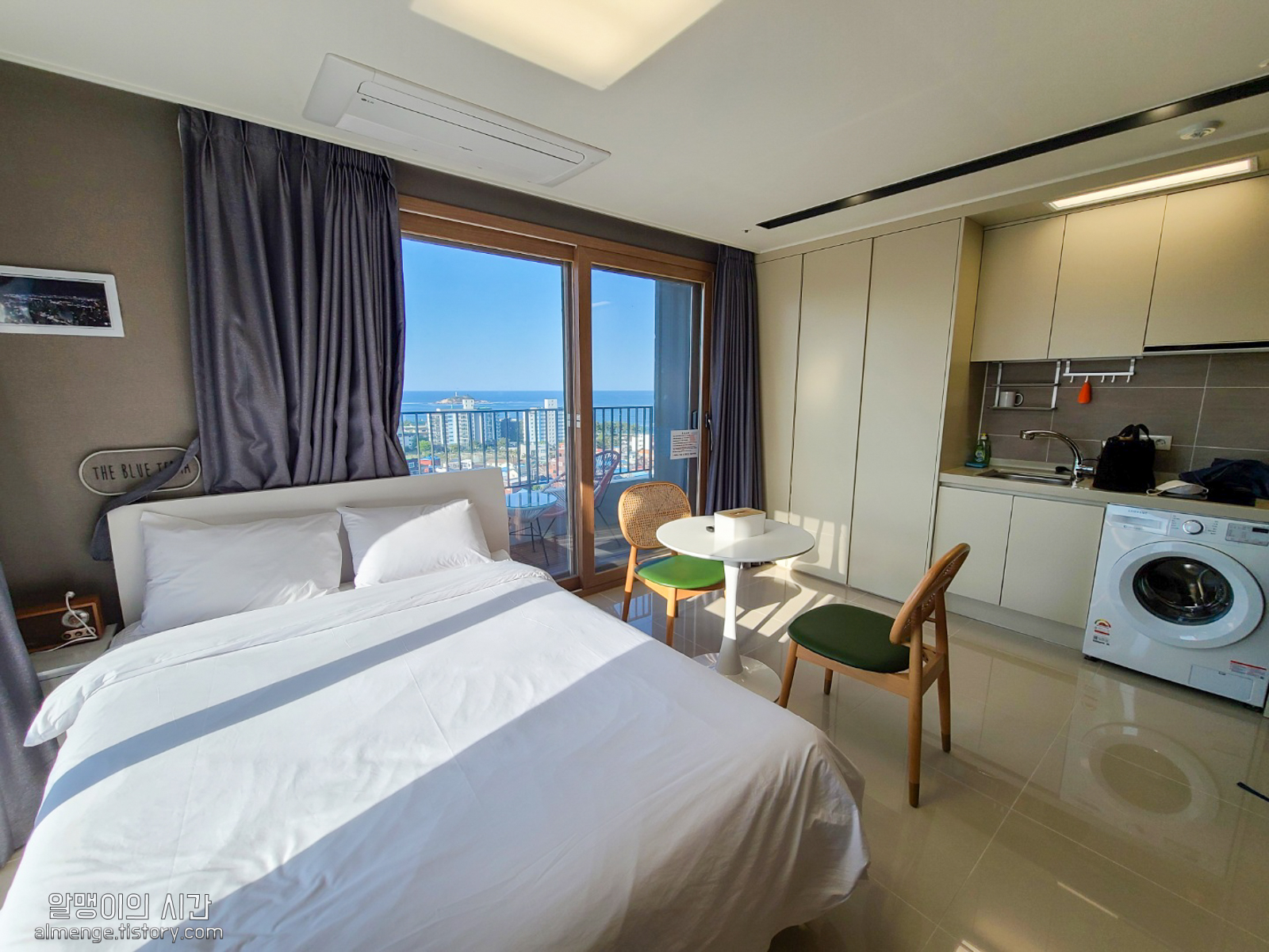 원룸이고, 세탁기, 싱크대, 전기 하이라이터, 옷장까지 갖추어져 있는 방이라 살짜쿵 자취방 느낌도 나지만, 창밖 풍경이 이미 일반 자취방이 아니죠잉 ㅎㅎ 오션뷰라니