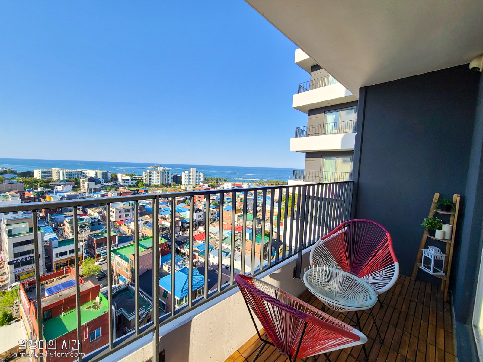 28층 건물인데 8층이어서 실망할 뻔 했는데, 8층임에도 불구하고 앞에 높은 건물이 없어 탁트여서 좋았던 발코니. 지난 번 고성 여행 때는 정말로 바다 코앞이었는데, 이번에는 바다가 바로 앞은 아니지만, 바다가 코앞이라 바다만 보이는 것 보단 시내도 같이 보여서 저는 좋았어요.