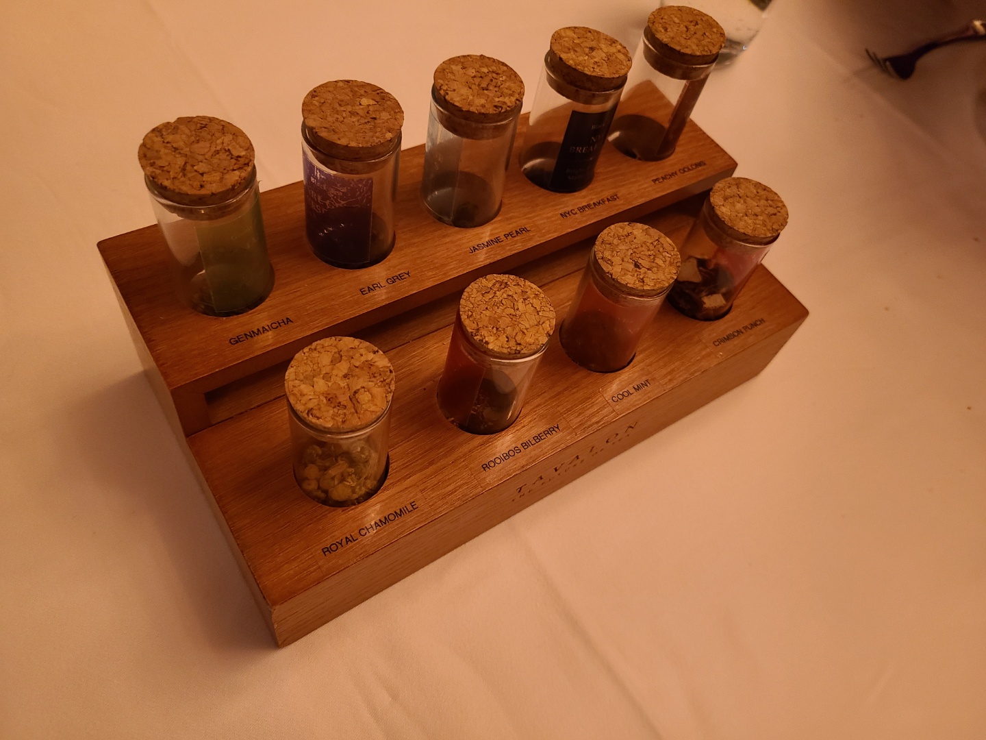 오늘은 커피대신 차를 마셔보기로 했어요. 9가지 차 중에 원하는 걸 고르면 됩니다. 윗줄은 카페인 함유된 차, 아랫줄은 무카페인 차에요. 향 맡아보고 원하는 티로 선택하면 돼요.