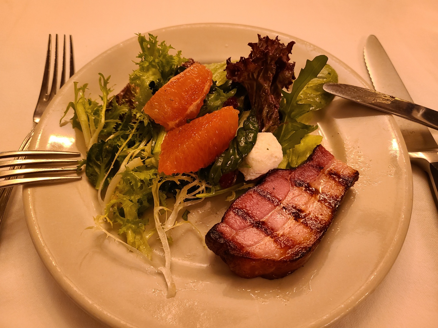빵을 다 먹으니 나온 에피타이저 리코타 샐러드와 베이컨. 커다란 볼에 나온 샐러드를 서버분이 접시에 옮겨 담아 주세요. 입맛을 돋구는 상큼한 드레싱에 버무려져 나온 스테이크와 리코타 치즈, 자몽이 맛있었어요. 샐러드 순삭!