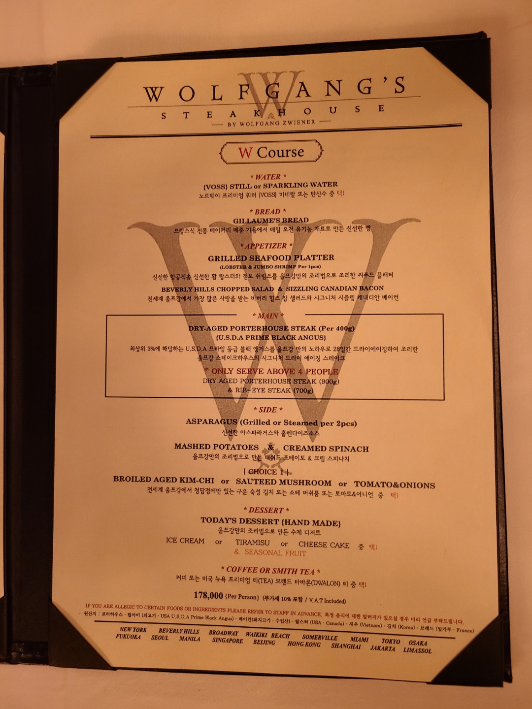 울프강 스테이크 하우스는 미국 본점과 지점, 일본, 필리핀, 중국, 홍콩, 싱가포르 그리고 우리나라에 지점을 가지고 있는 스테이크 전문 레스토랑이에요.