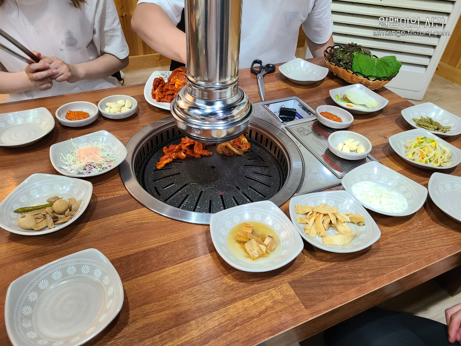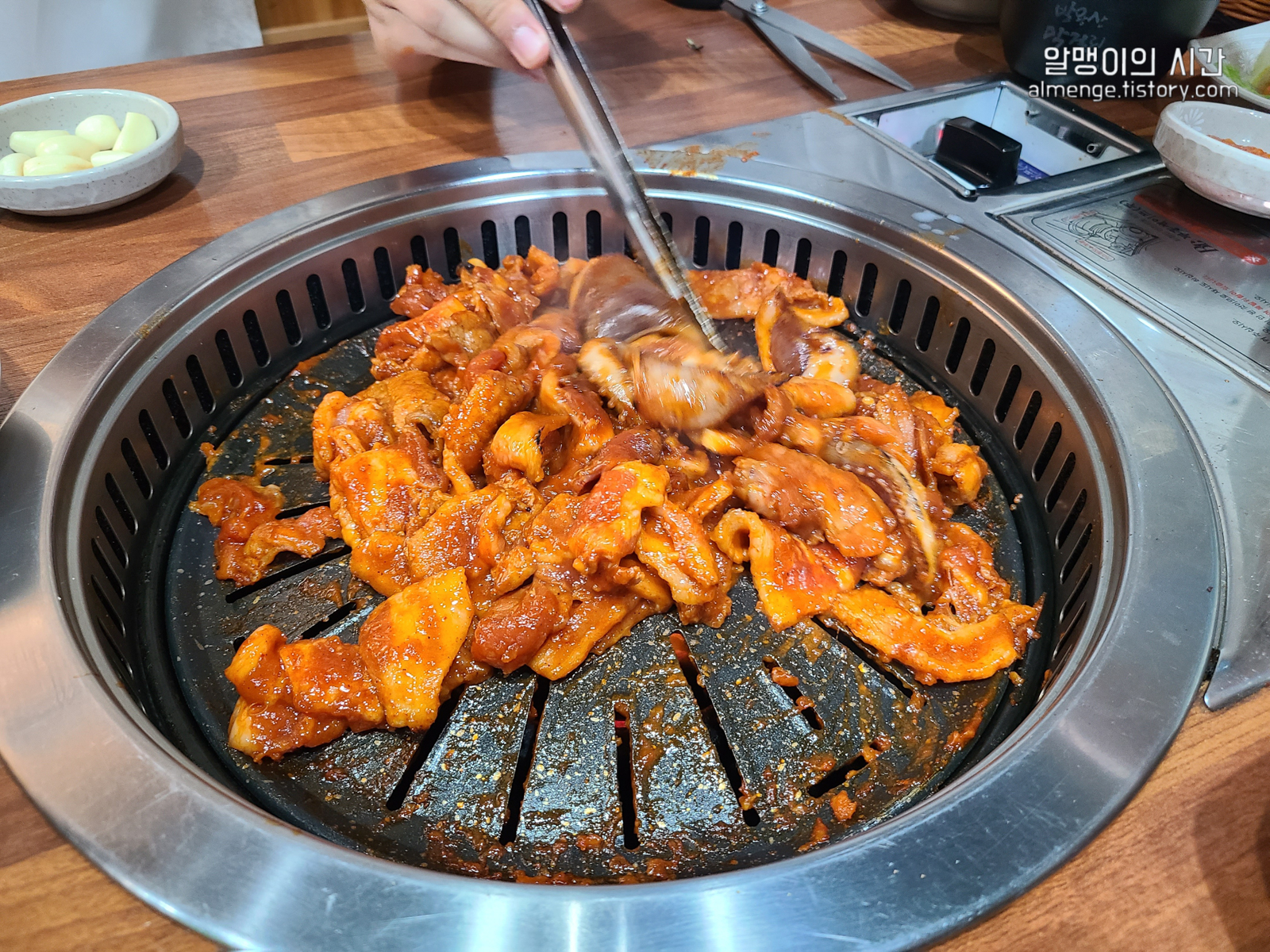 역시나 손이 안보임 ㅋㅋㅋ 장사 잘되는 집이라 고기 상태나 오징어 상태는 싱싱하니 좋은 편이었고 냄새도 안났어요. 까딱 방치하고 수다 떨다가는 순식간에 타게 되니 다 익기 전까지는 신경써서 구워주세요.