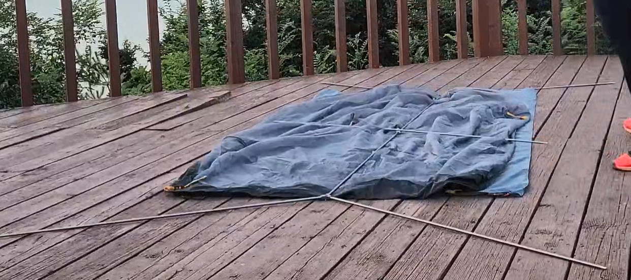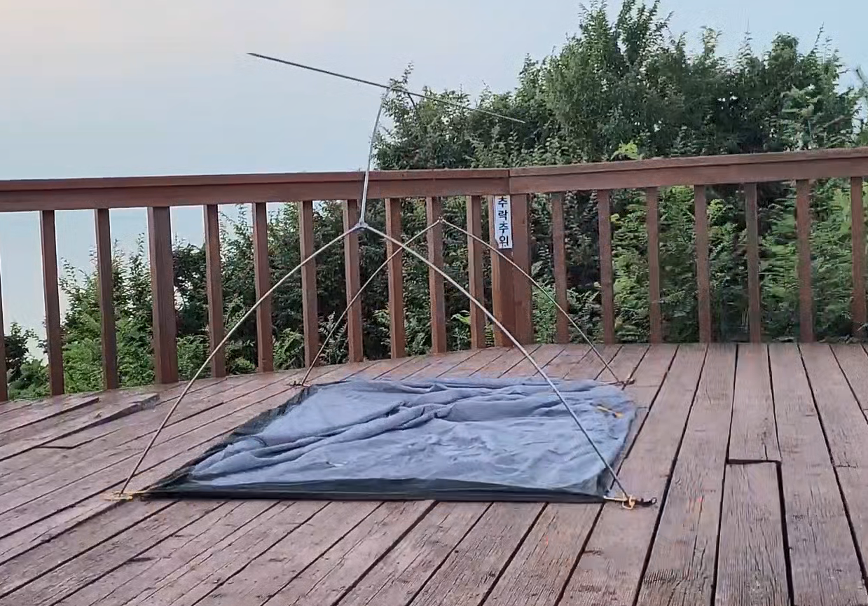(3) 폴대를 다 연결해서 이너텐트 위에 놓는다. (폴대는 일체형이라 파우치에서 꺼내 펴주기만 하면 쏙쏙 끼워진다.)