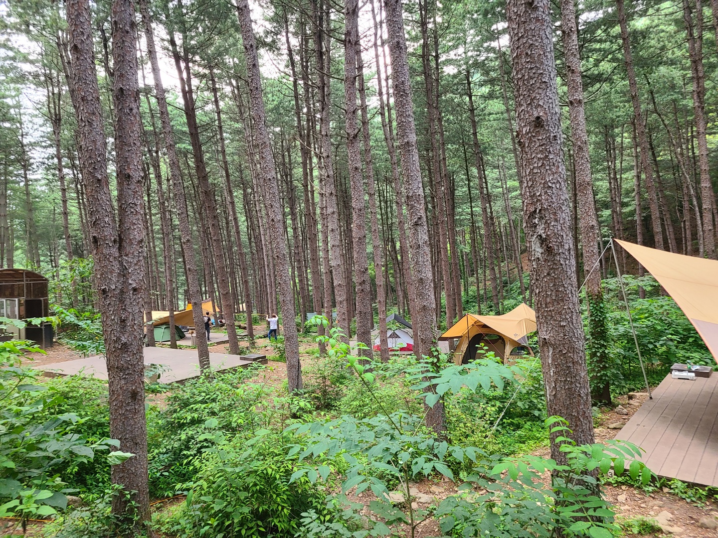 다섯시가 넘어 도착하니 이미 도착해 있는 캠퍼들이 저마다 좋은 장비 뿜뿜하며 휴식 중. 캠핑장은 정말 잣나무 숲속에 있어 자연사이에서 묻어가는 느낌도 든다. 이런 느낌 너무 좋아 ㅠㅠ